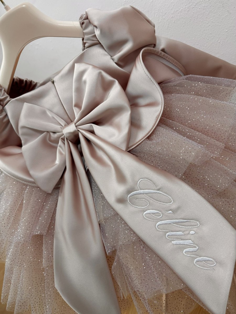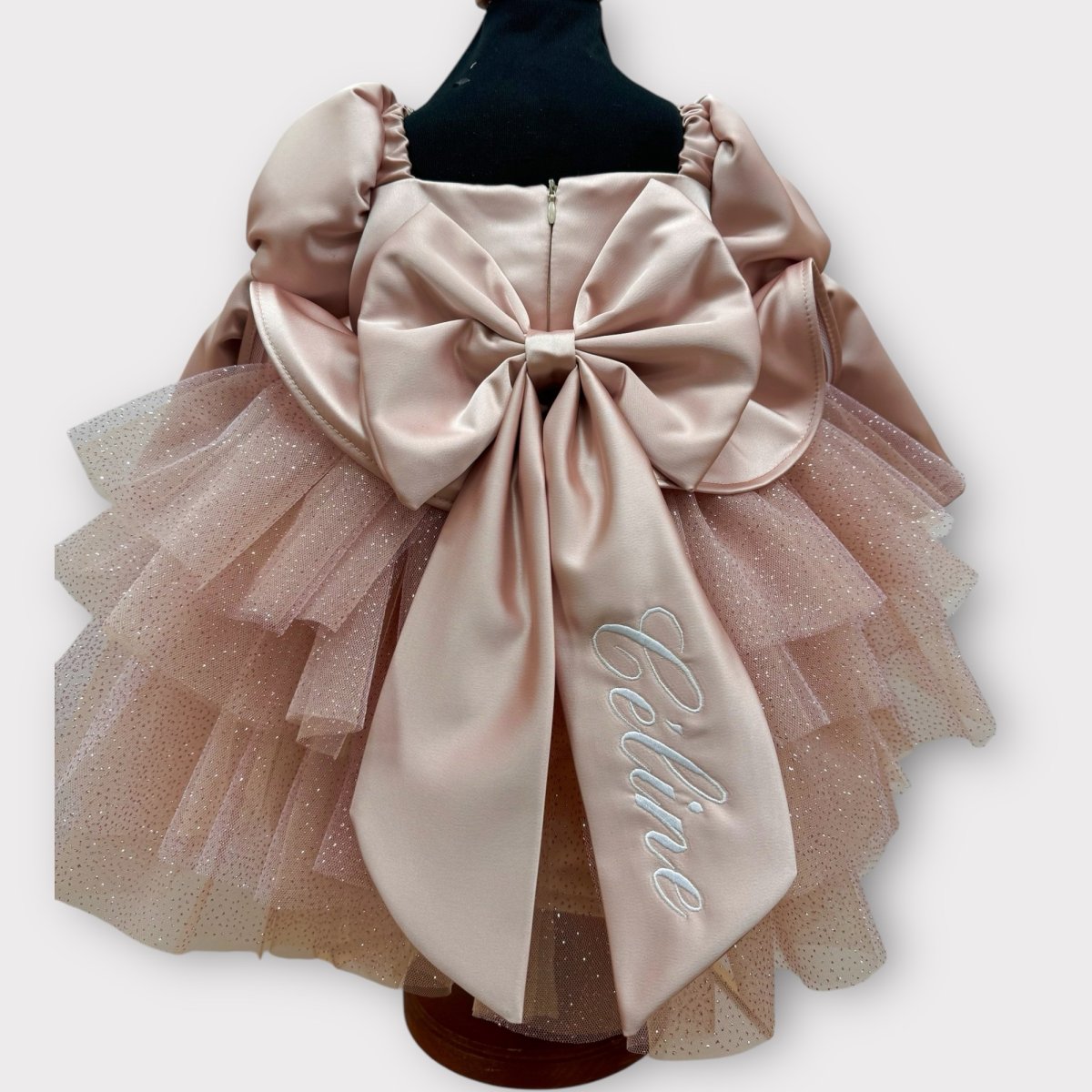 Abito balze in seta rosa e tulle glitter molto delicato