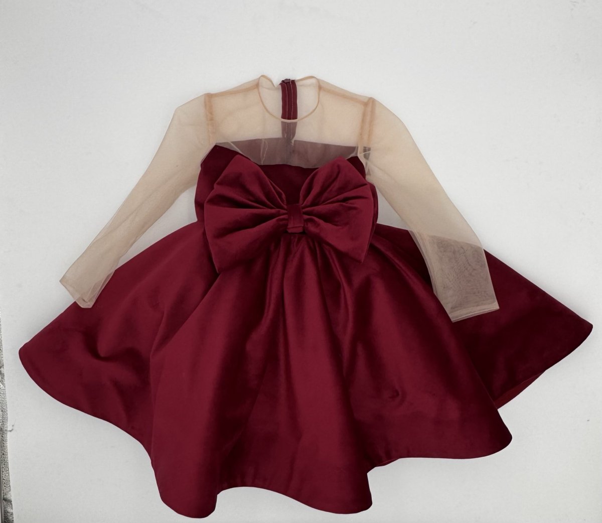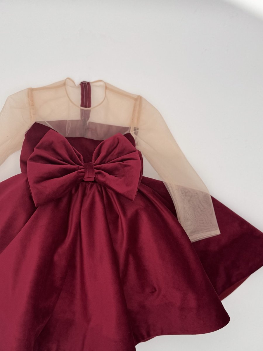 Abito bimba in velluto bordeaux fiocco avanti e scollatura in tulle