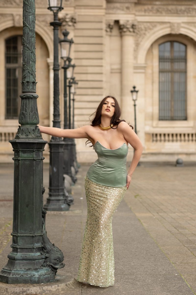 Un bustino steccato lungo in seta con gonna in perline e paillettes è l’incarnazione della raffinatezza e del glamour, un abito che unisce il design elegante alla sensualità sofisticata. Il bustino, realizzato in seta lucente e modellato con stecche, abbraccia il corpo in modo perfetto, scolpendo la silhouette con grazia e offrendo un supporto che esalta la figura senza compromettere il comfort. La seta, morbida e fluida, aggiunge un tocco di lusso, mentre la struttura steccata conferisce una sensazione di solidità e definizione.