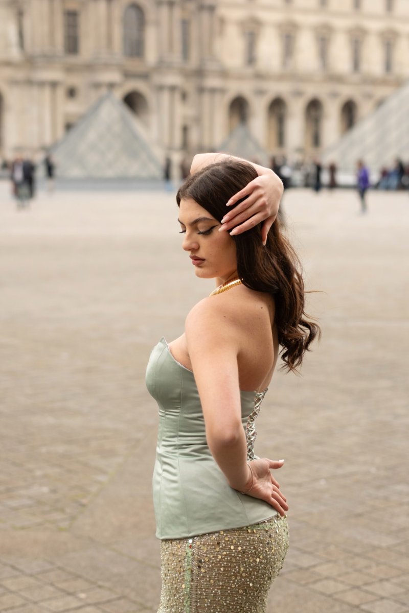 Abito corpino di perline verde salvia e gonna in seta