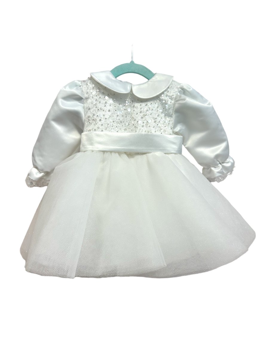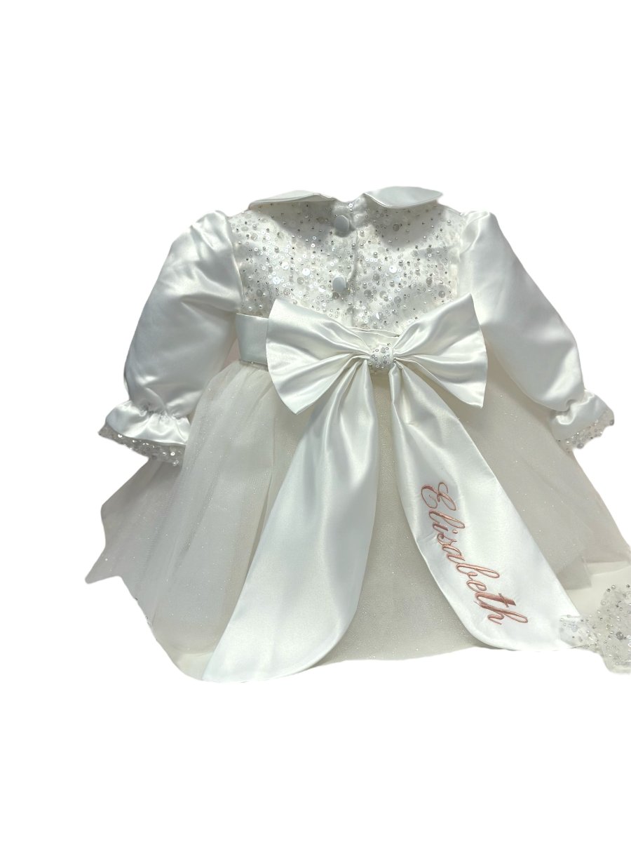 Abito manica lunga con corpino in perline e paillettes , collo con seta, gonna in tulle con cintura con fiocco personalizzato