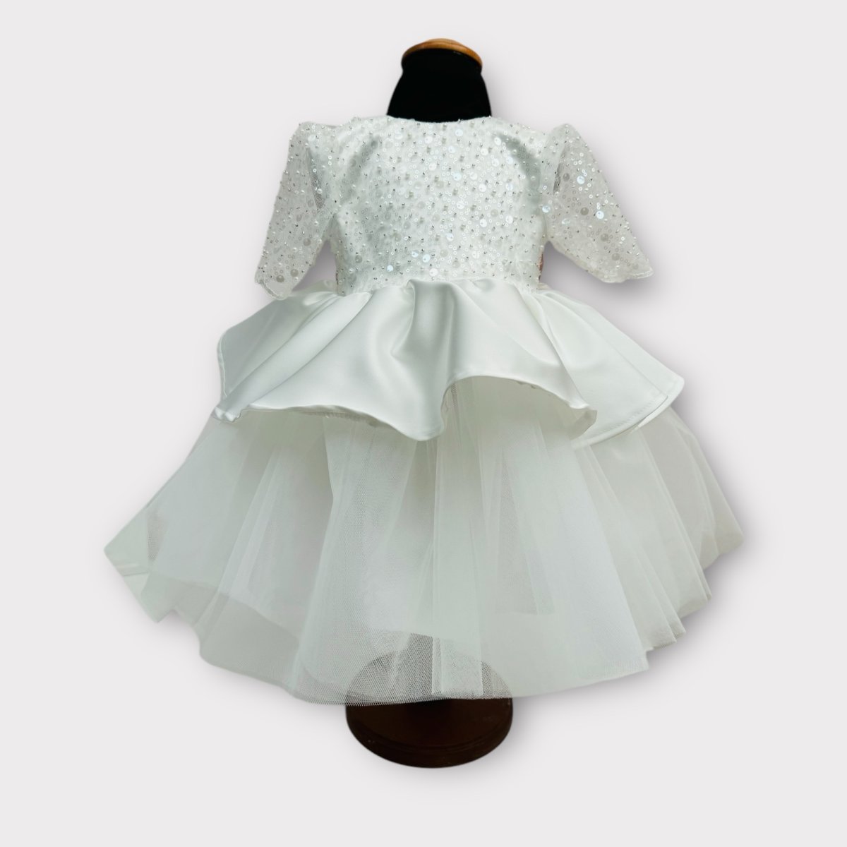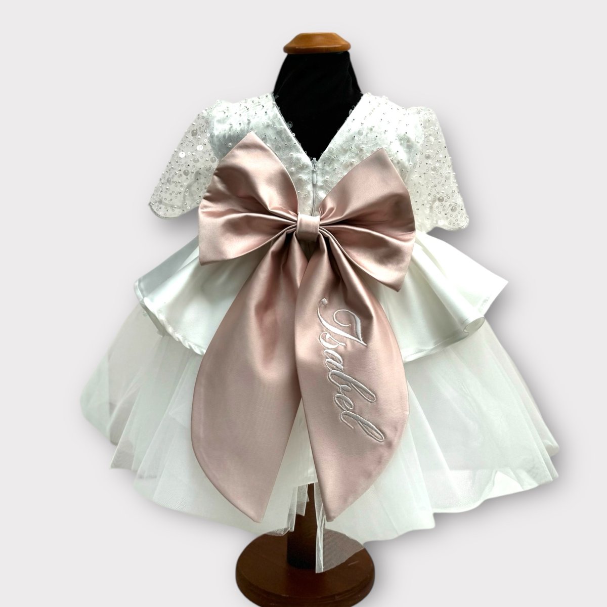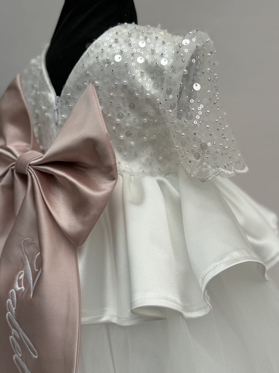 Abito corpino in perline e micro paillettes , con manica 3/4 , gonna con balza in seta e tulle sposa , cintura rimovibile con fiocco dietro personalizzato Adatto per un Battesimo , damigella , compleanno