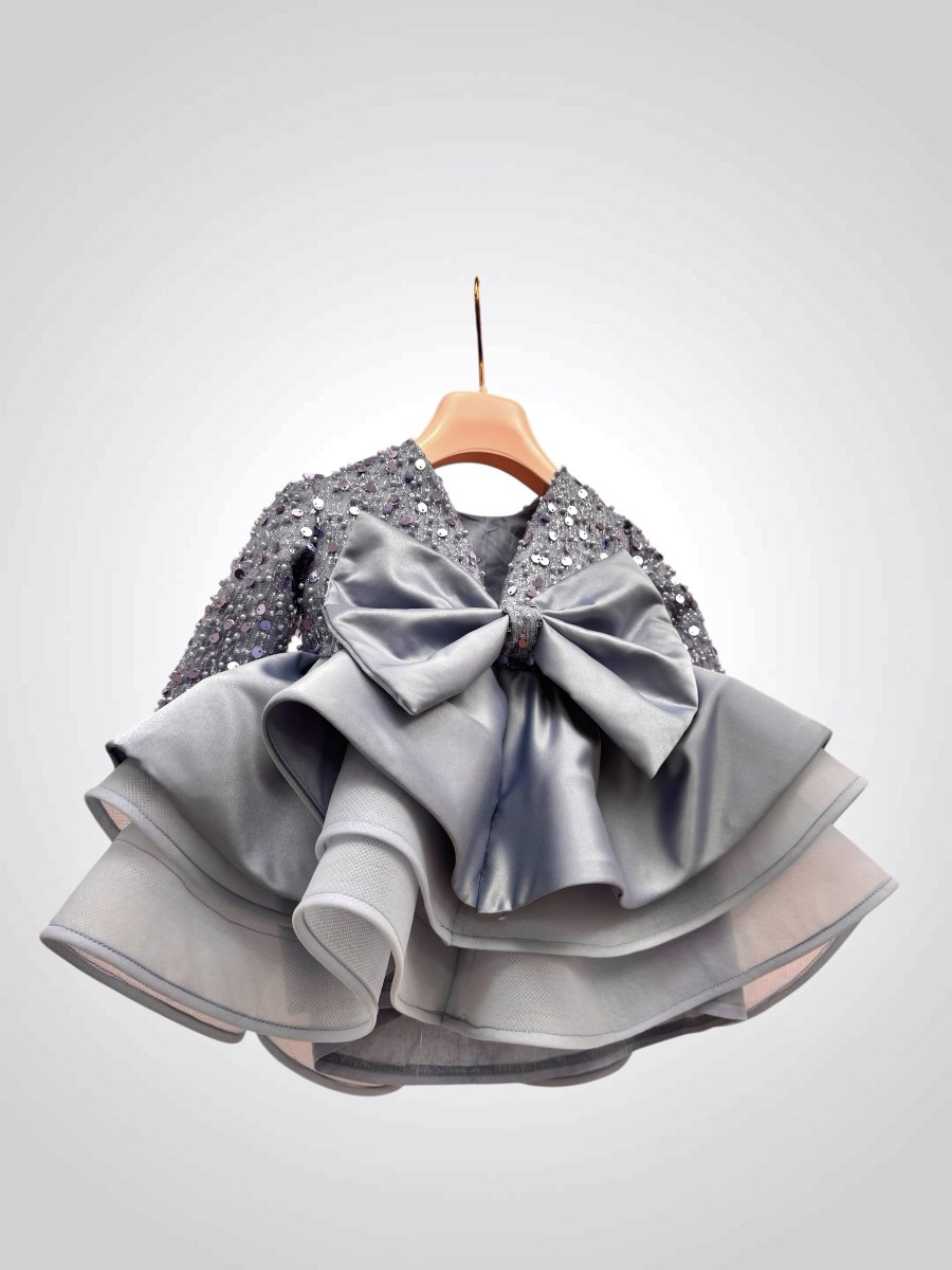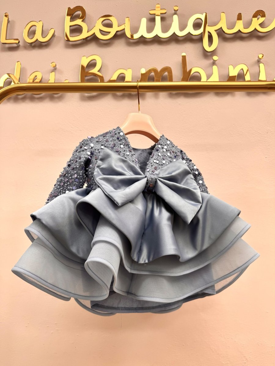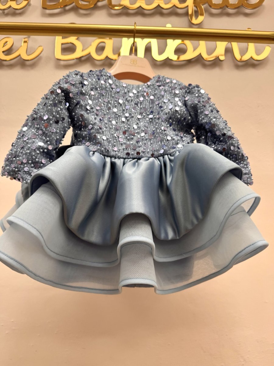 Abito bimba in celeste polvere con corpino in perline e gonna in seta