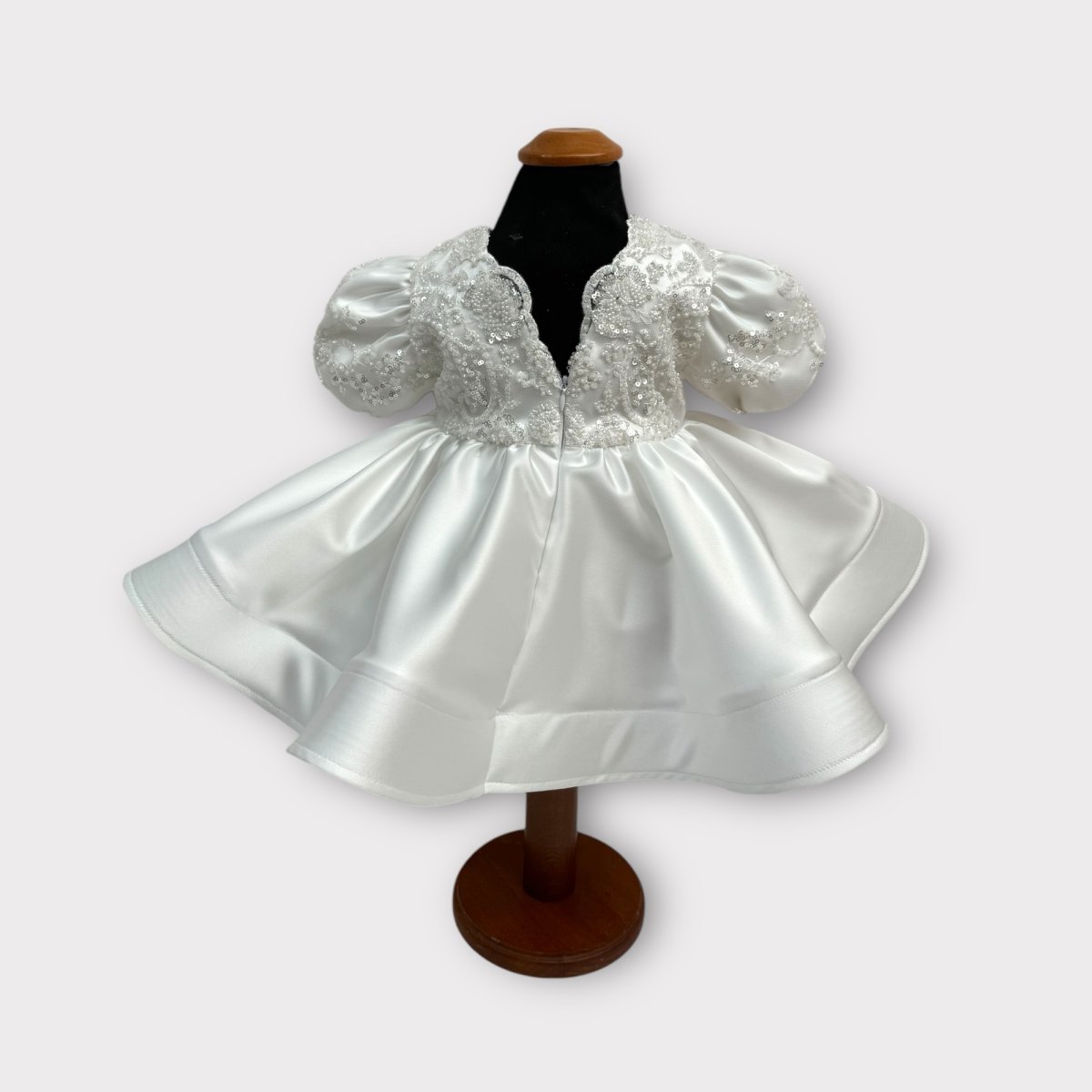 Abito corpino in pizzo scollo a fiore dietro, gonna ampia in seta con tulle sotto per ampliare