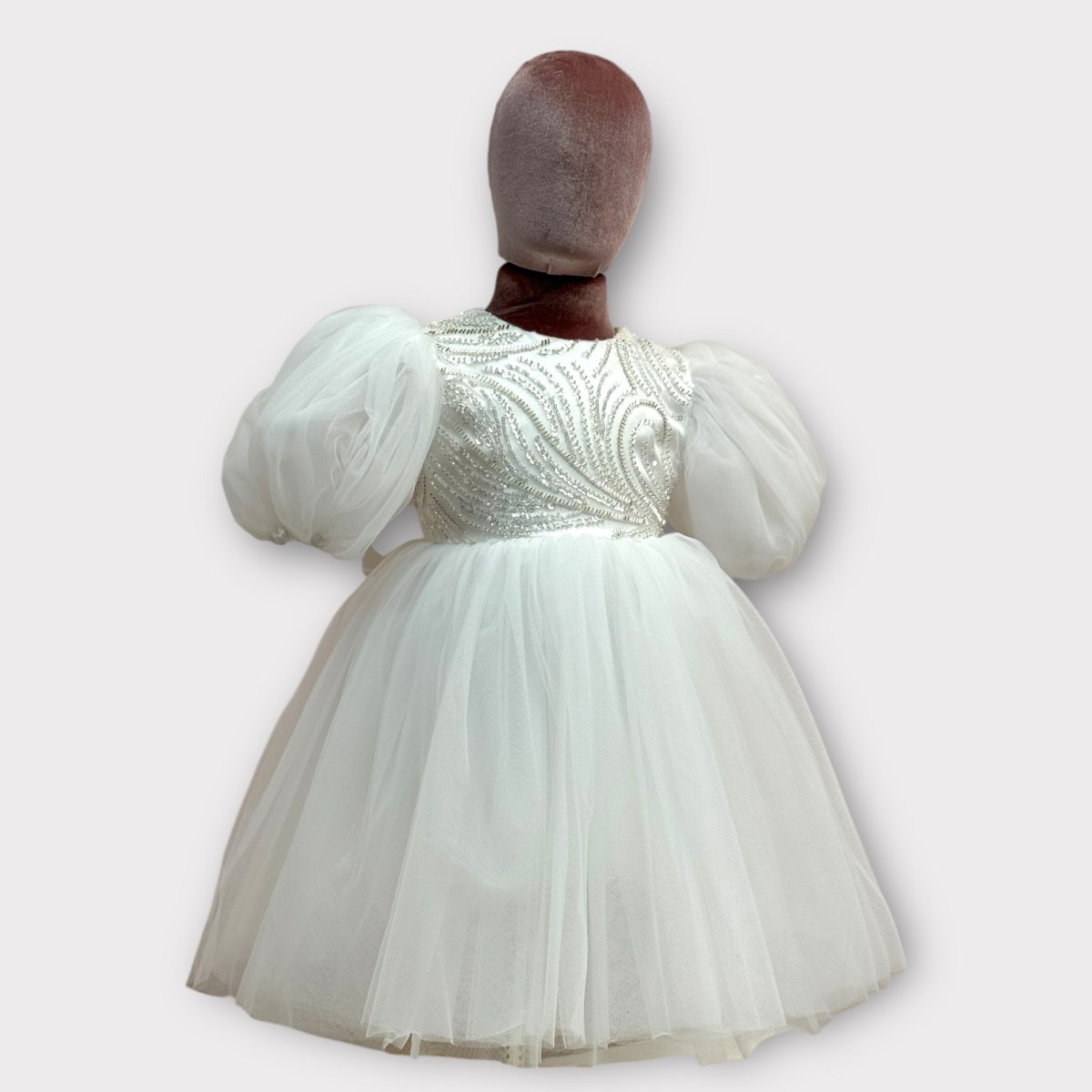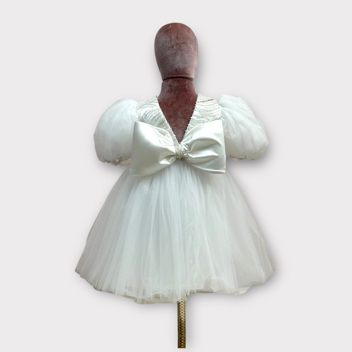 Abito gonfio in tulle sposa, corpino lavorato con perline e fiocco rigido dietro