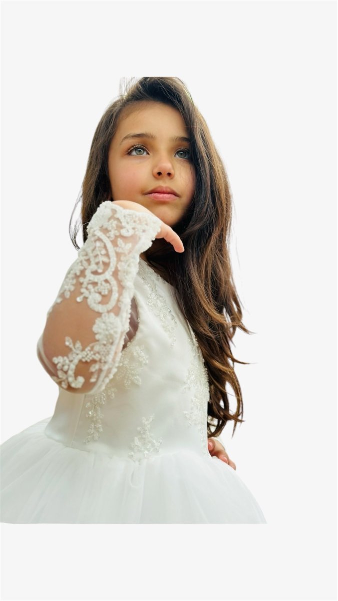L’abito da comunione con gonna in seta rimovibile e corpino in pizzo floreale è un’opera di eleganza e raffinatezza, ideale per una giovane protagonista del giorno della sua comunione. Il corpino è realizzato in pizzo floreale, un tessuto delicato che aggiunge un tocco romantico e sofisticato, con dettagli di fiori intrecciati che creano un gioco di trasparenze e texture. La parte superiore dell’abito potrebbe essere a maniche lunghe o senza maniche, con una leggera scollatura dietro, enfatizzando la grazia della figura. Gonnellone in seta rimovibile e gonna corta in tulle
