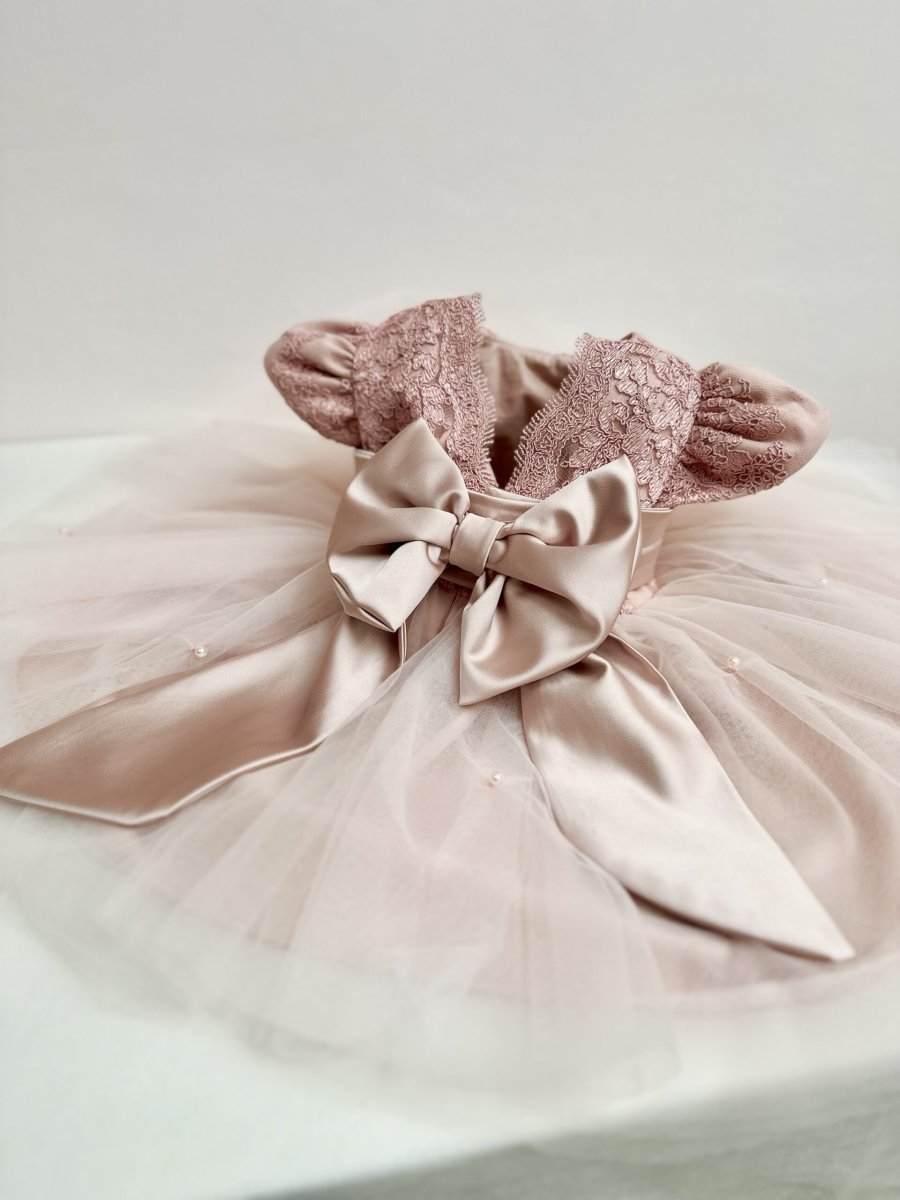 Abito con corpino in pizzo e gonna in tulle con perline cucite a mano