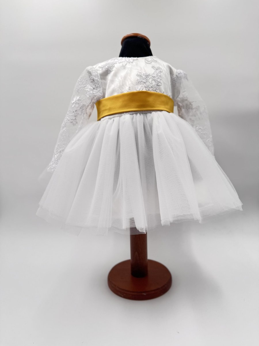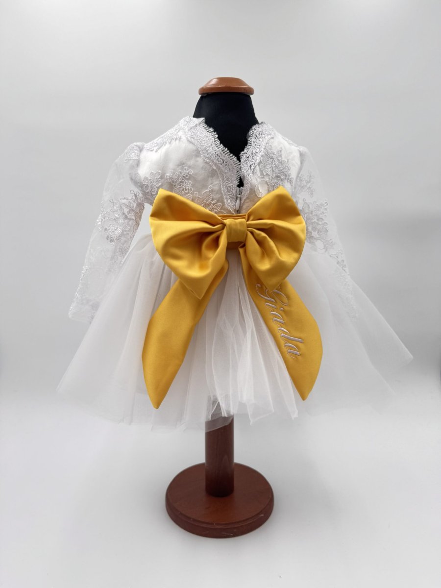Abito con corpino in pizzo e gonna in tulle , cintura in seta gialla con personalizzata