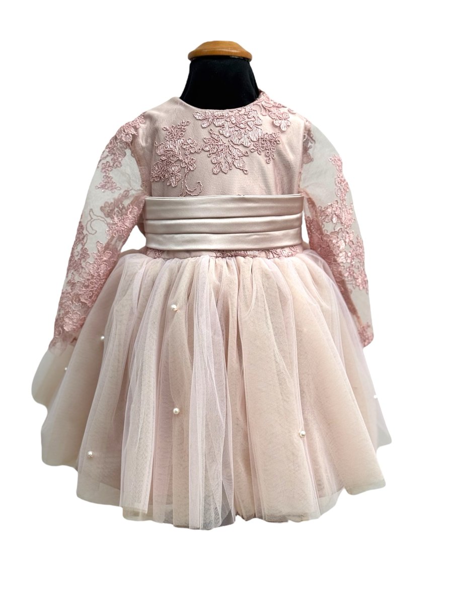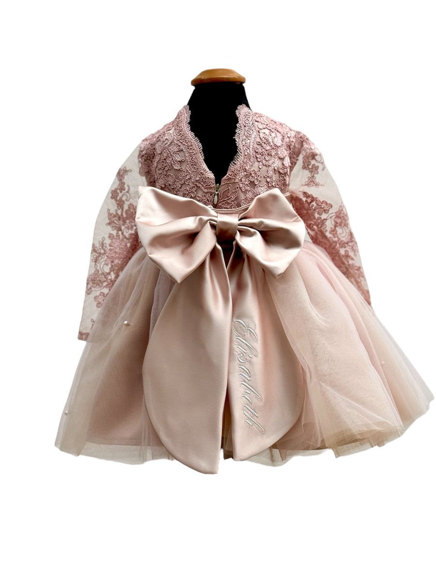 Immagina un abito elegante e raffinato per una bambina, perfetto per un’occasione speciale. Il vestito è realizzato in morbido tulle di alta qualità, con una base color rosa cipria che dona un’aria delicata e romantica. La parte superiore è in pizzo leggero, con piccoli ricami floreali che aggiungono un tocco di raffinatezza. Le maniche sono lunghe, delicate, e il fiocco personalizzato.