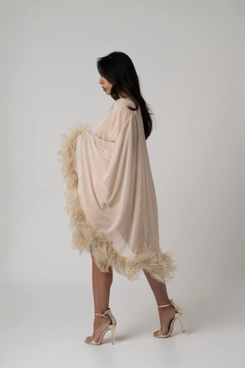 Chiffon impalpabile e piume di struzzo: un abito leggero ma di grande effetto, perfetto per le occasioni speciali.