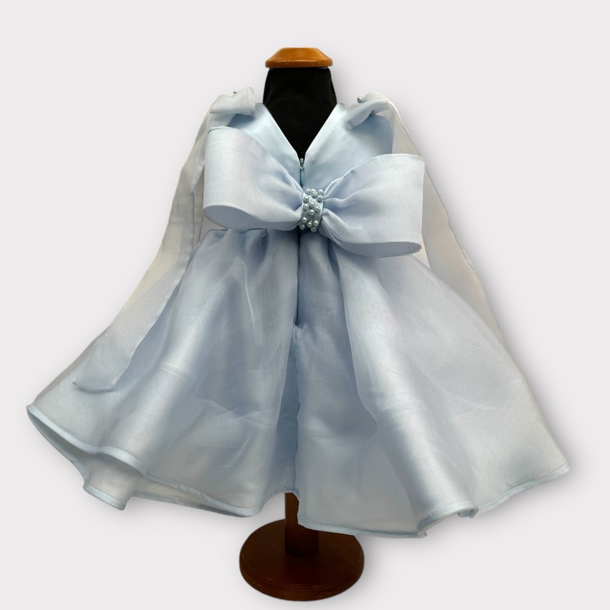 Abito in organza di cotone con cinturino basso in perle cucite a mano, fiocco indietro rigido , e fiocco sulle spalle dettaglio in perline polvere