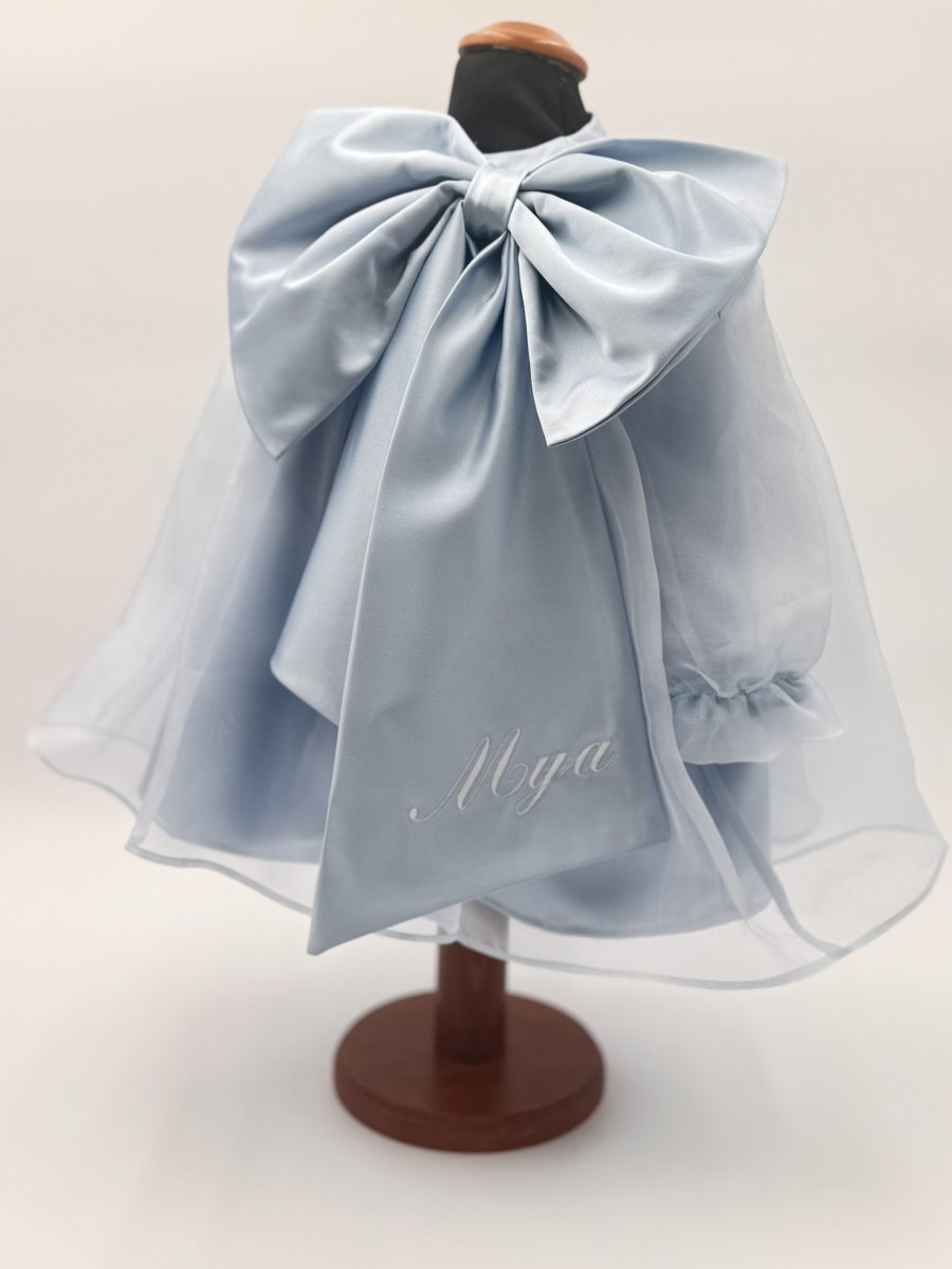 Un abito in organza celeste baby con fiocco grande applicato a mano e code lunghe personalizzate è una scelta romantica, elegante e scenografica 💙 Perfetto per cerimonie,battesimo, damigella, compleanno.