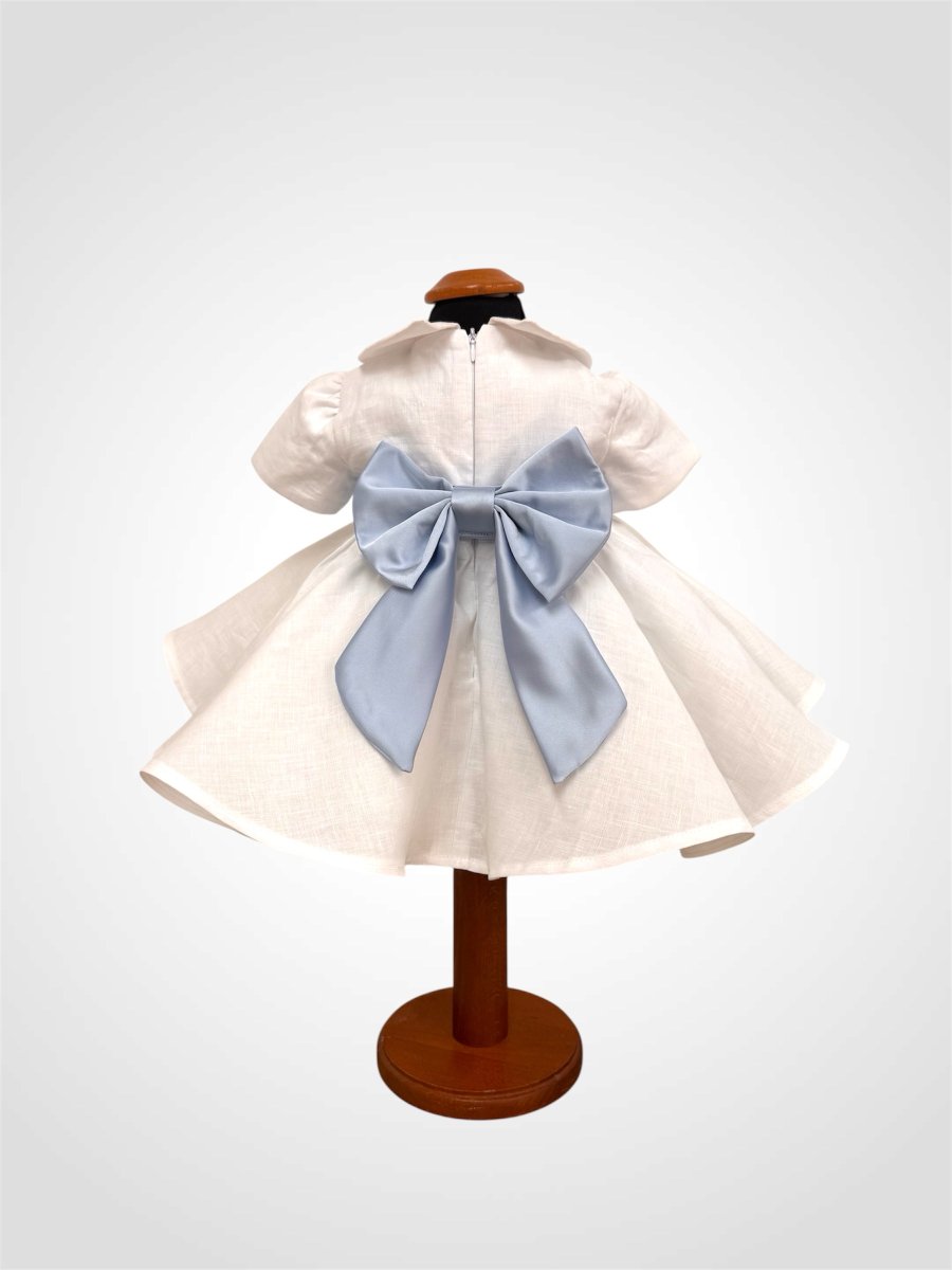 Abito in puro lino con pizzo sul corpetto e collo tondo personalizzato e fiocco in seta azzurra personalizzata