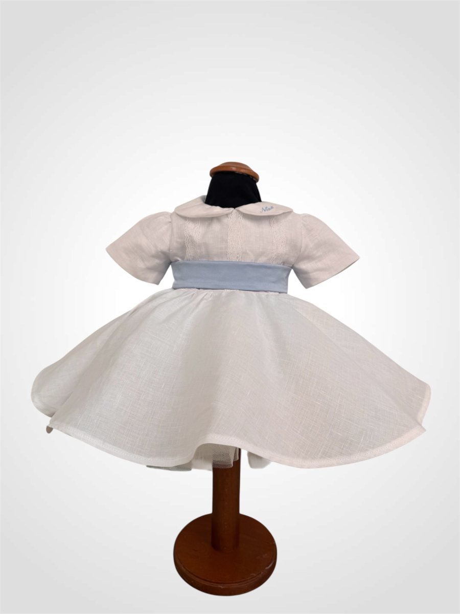 Abito in puro lino con pizzo sul corpetto e collo tondo personalizzato , con aggiunta di tulle per ampliare e fiocco in seta azzurra personalizzata