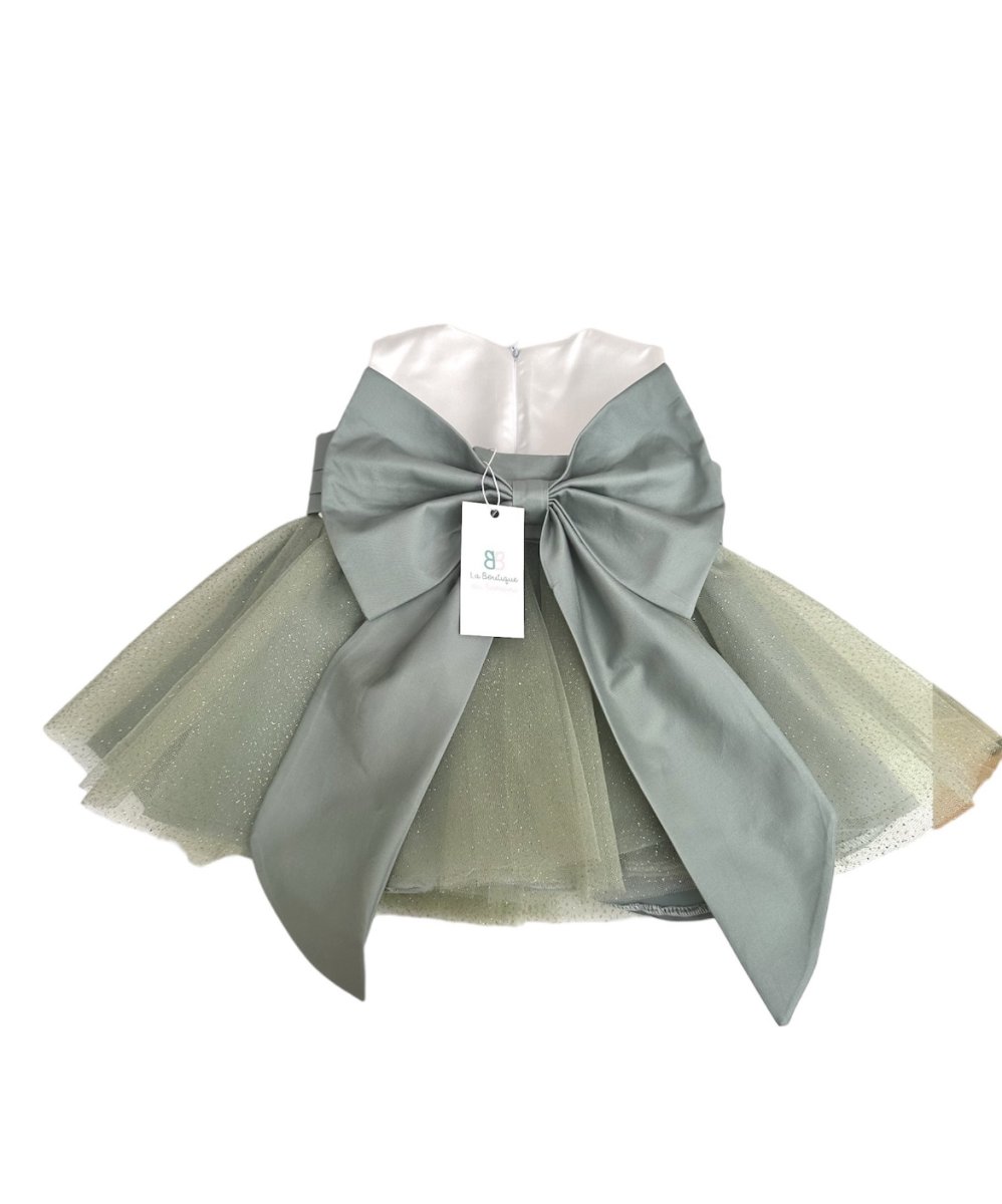 Abito in rasatello di cotone con gonna glitter e fiocco sul retro
