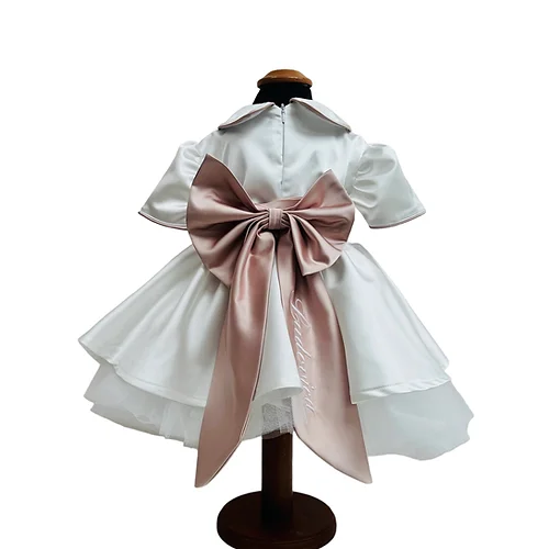Abito in cady di seta con profilo a contrasto, collo tondo, cintura rimovibile personalizzabile, tulle sul fondo.