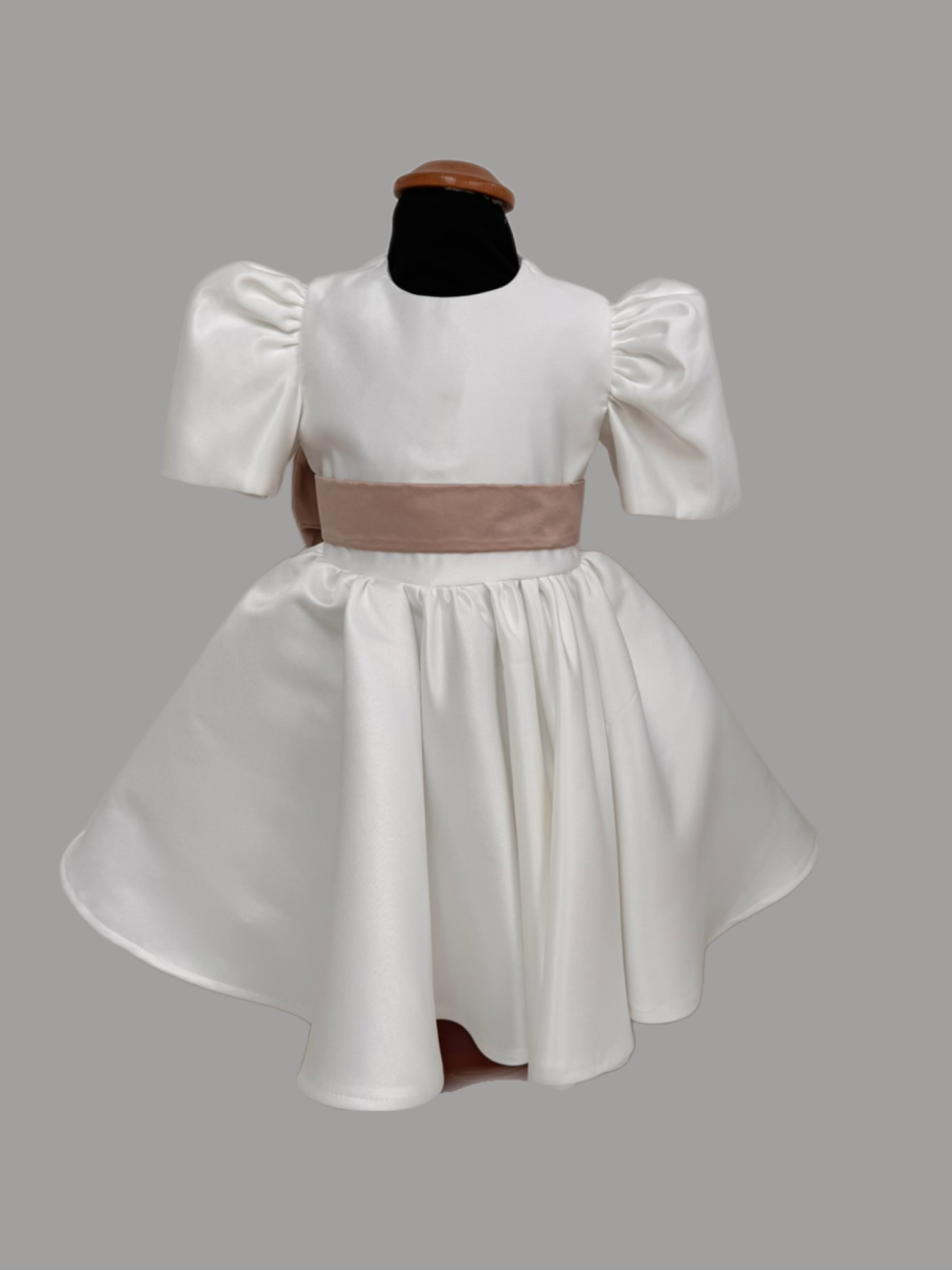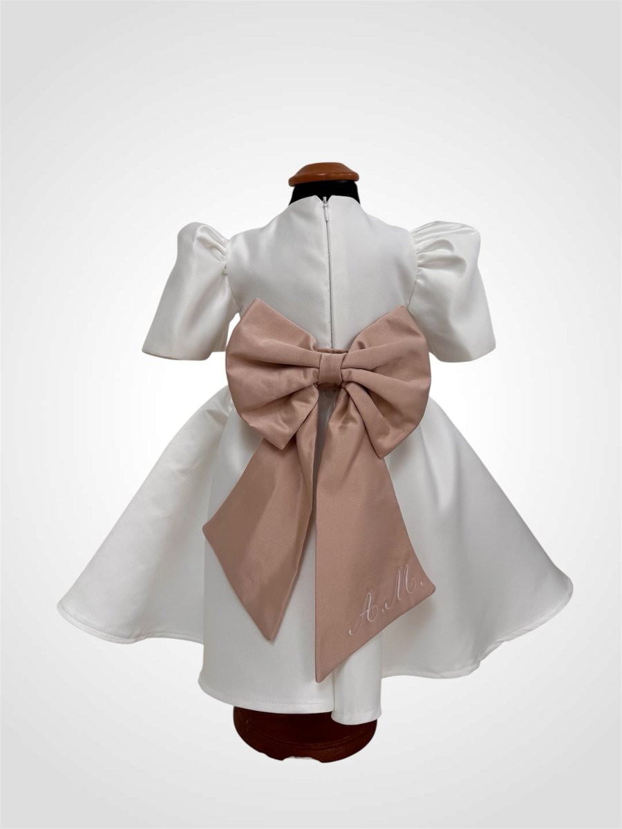 Abito in seta con arriccio sulla spalla e fiocco in seta rosa personalizzato