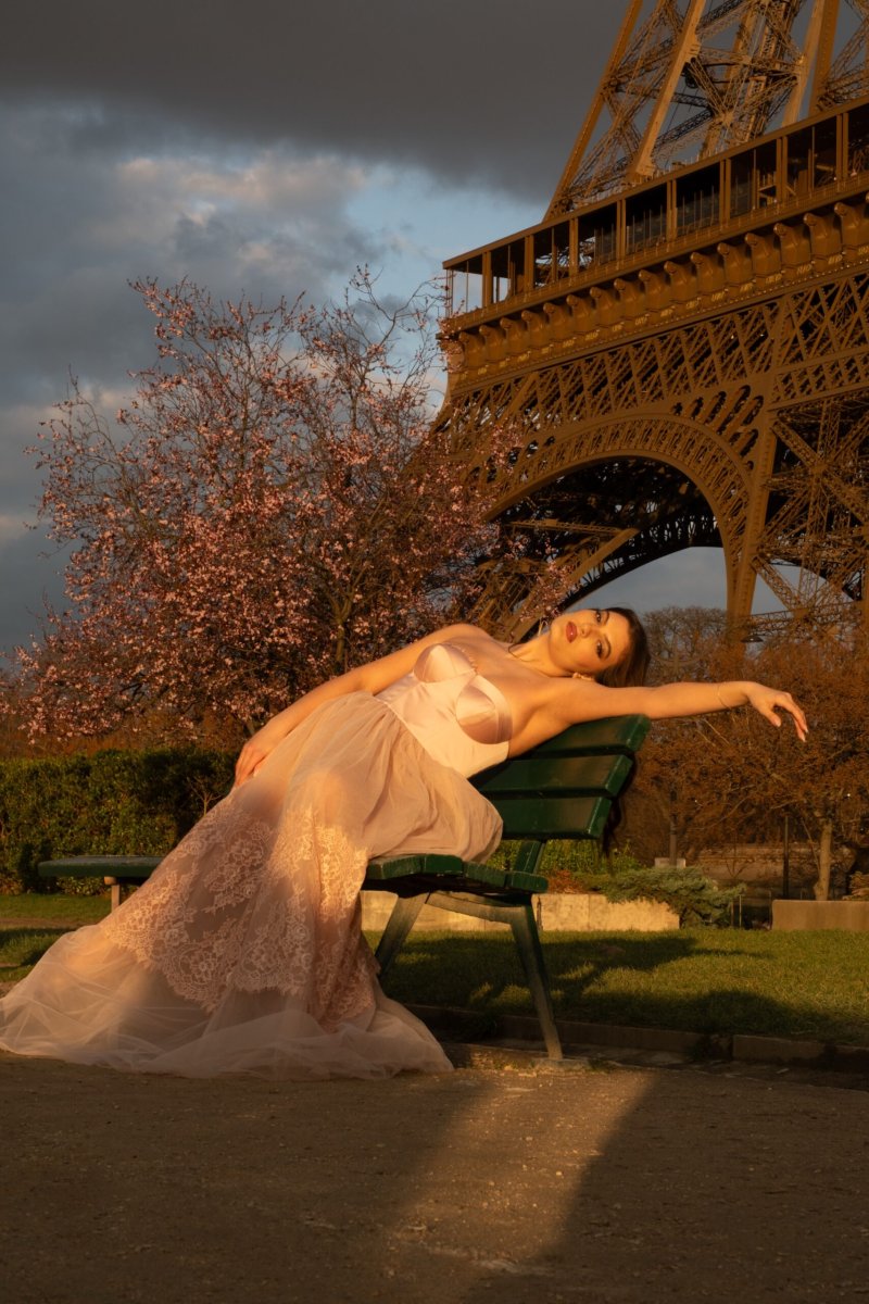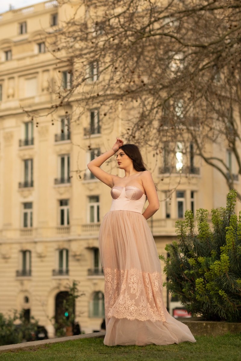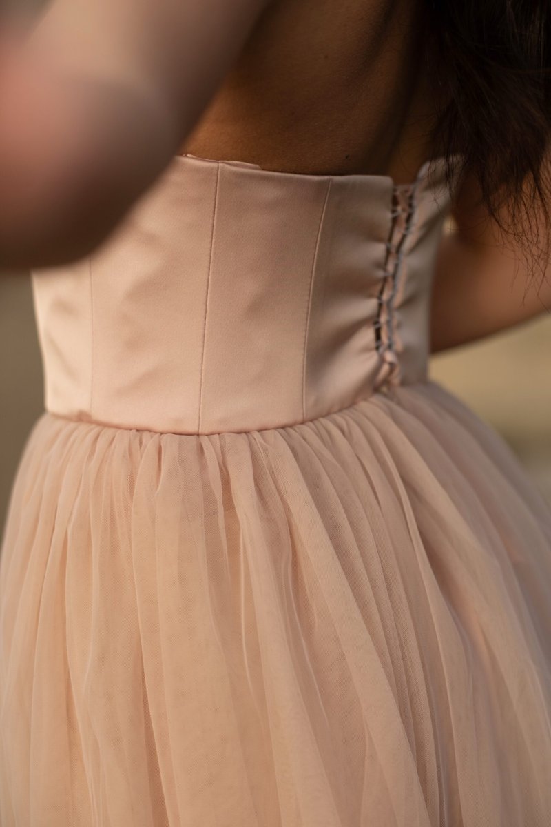 Eleganza senza tempo: abito in seta con gonna in tulle, per uno stile raffinato e leggero come un soffio.