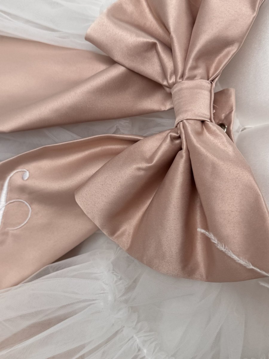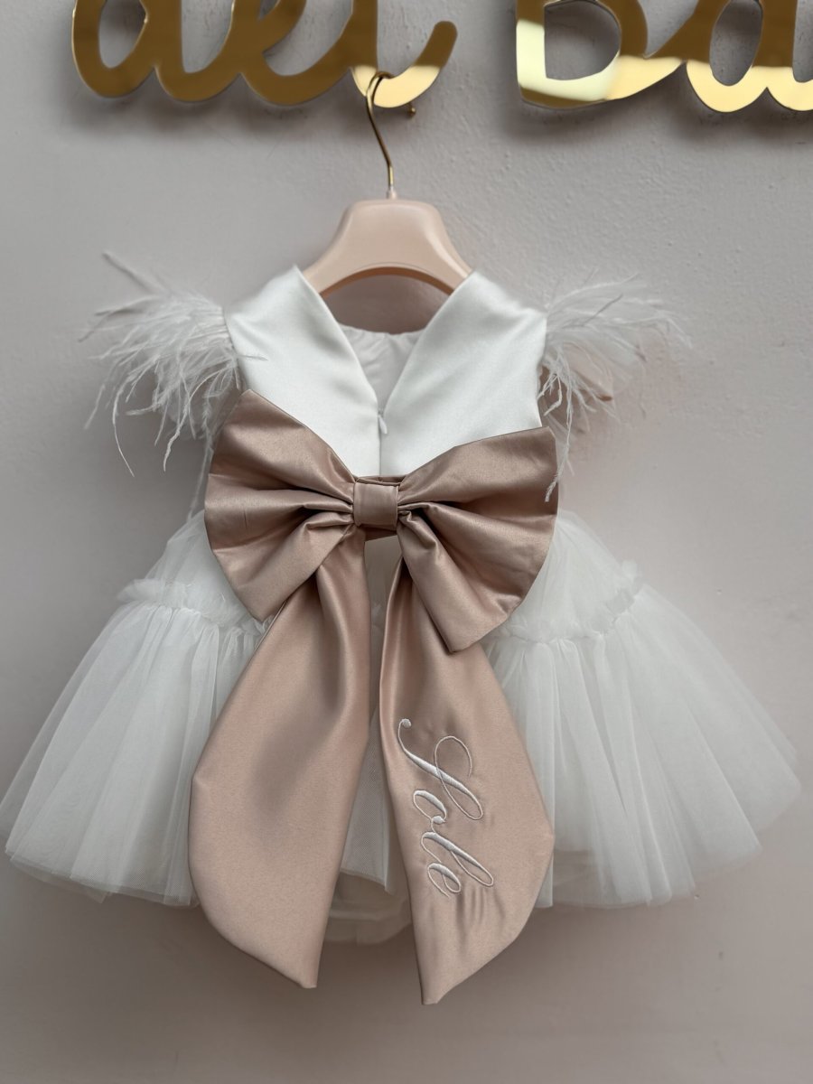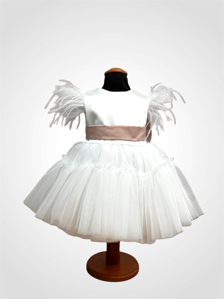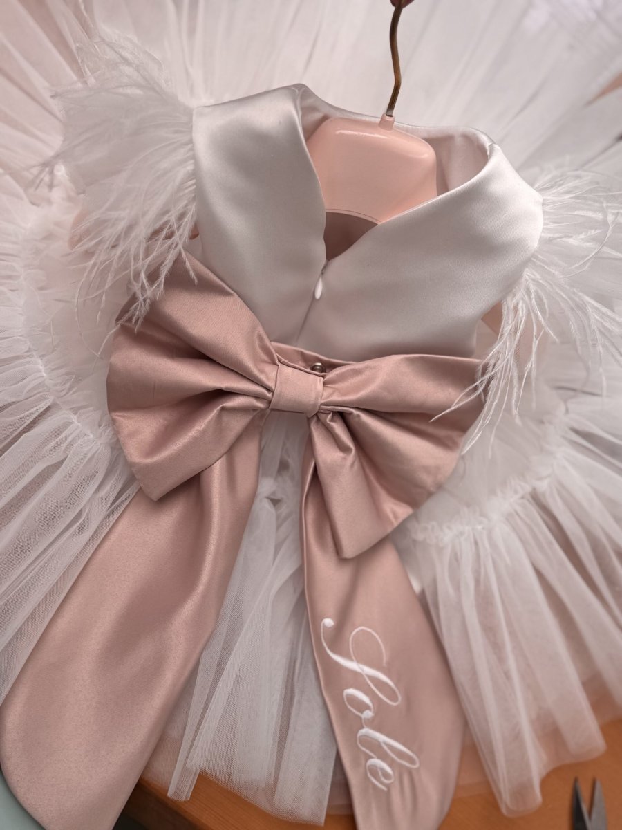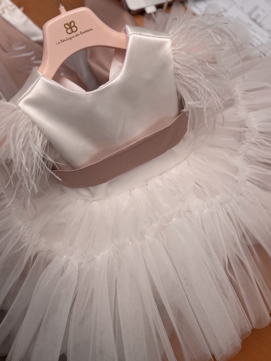 Abito in seta con dettagli di piume nel giro manica , gonna in tulle con balza e cintura rosa con fiocco personalizzata