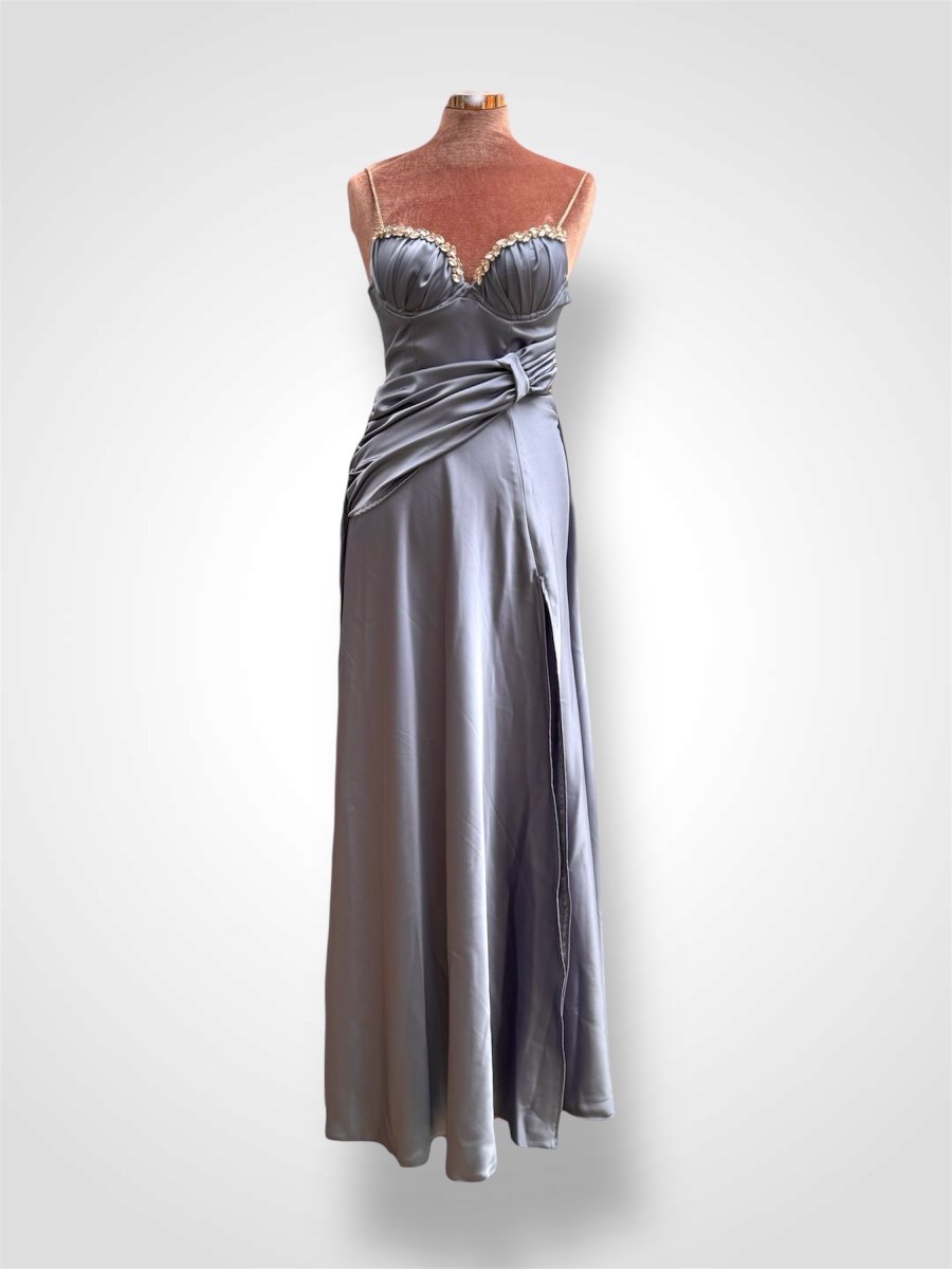 Questo raffinato abito in azzurro polvere incarna grazia e romanticismo. Il design presenta un delicato scollo a cuore, che valorizza il décolleté con sobria sensualità, donando un tocco femminile e sofisticato. Lo scollo è impreziosito da cristalli Swarovski finemente applicati a mano, che catturano la luce con discreta eleganza, creando riflessi luminosi ad ogni movimento. Il tessuto, leggero e fluido, accarezza la silhouette con naturalezza, mentre il taglio valorizza la figura senza costrizioni. Ideale per cerimonie, eventi serali o occasioni speciali, questo abito unisce semplicità e ricercatezza, per una bellezza senza tempo.