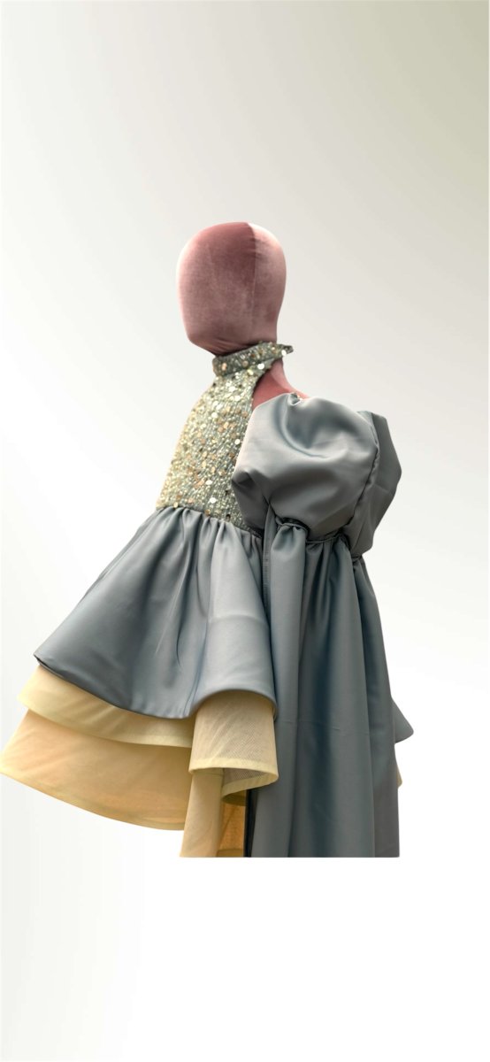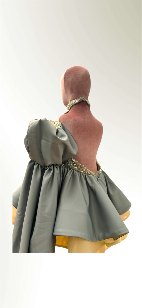 Abito in seta verde salvia con Corpino di perline e manicotti con strascico