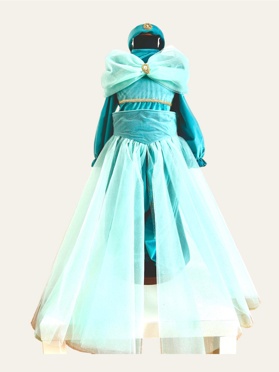 Abito Jasmine, per la tua festa speciale o per carnevale. Presenta un bellissimo body in velluto con dettagli sul corpino, rouches sulle spalle rimovibili e pantalone largo. Ad arricchire il tutto sono la gonna in tulle ed cerchietto.