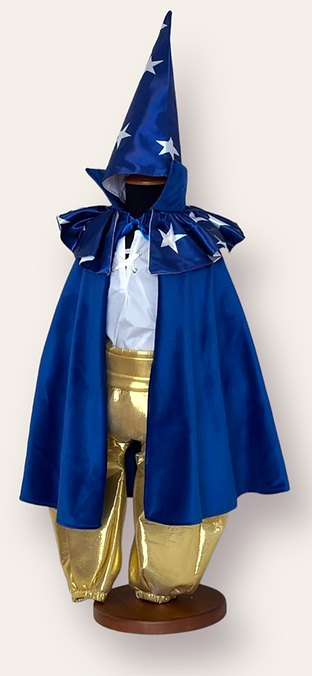 Abito mago, creato a mano, con pantalone dorato con cintura e camicia in cotone. Ad impreziosire il tutto sono il bellissimo mantello in velluto e il cappello a punta.
