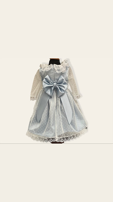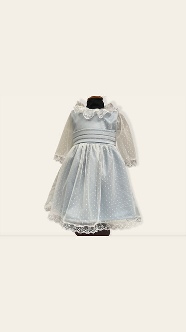 Un abito romantico ed elegante per la tua piccola. Disponibile in tre colazioni, rivestite da un delicato tessuto a pois e pizzo bianco.