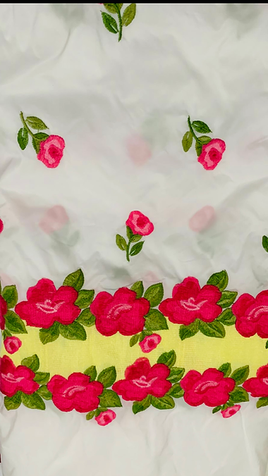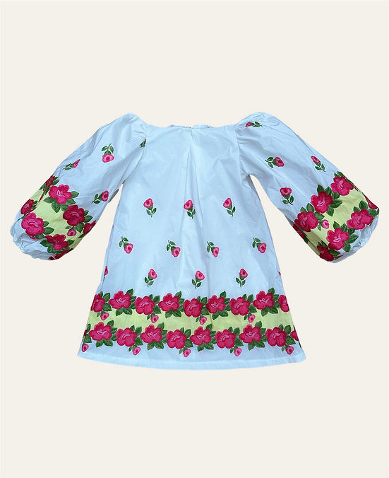 Un delicato e principesco abitino per la tua piccola, realizzato minuziosamente a mano, in tessuto taffettà, impreziosito da una moltitudine di fiori ricamati.