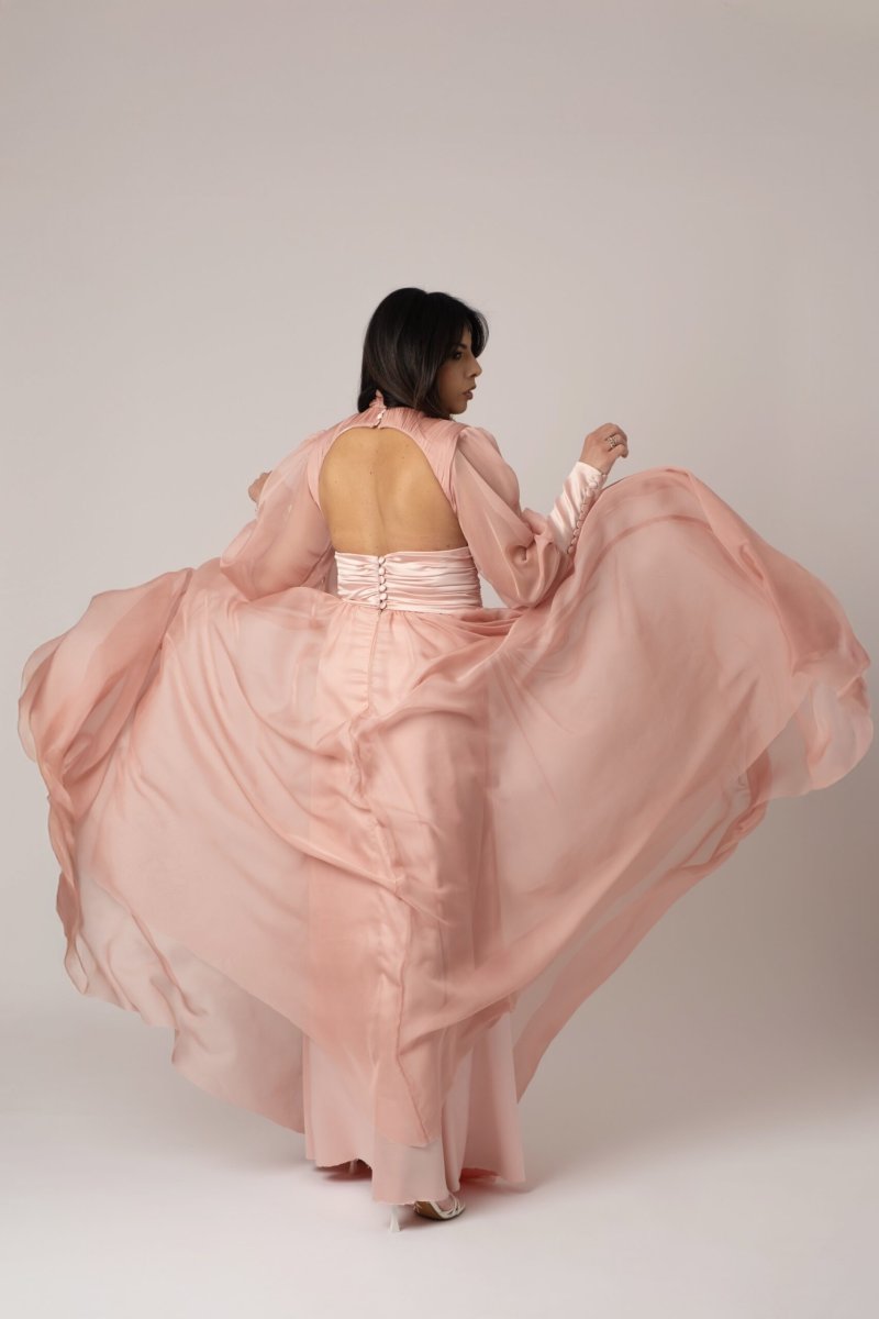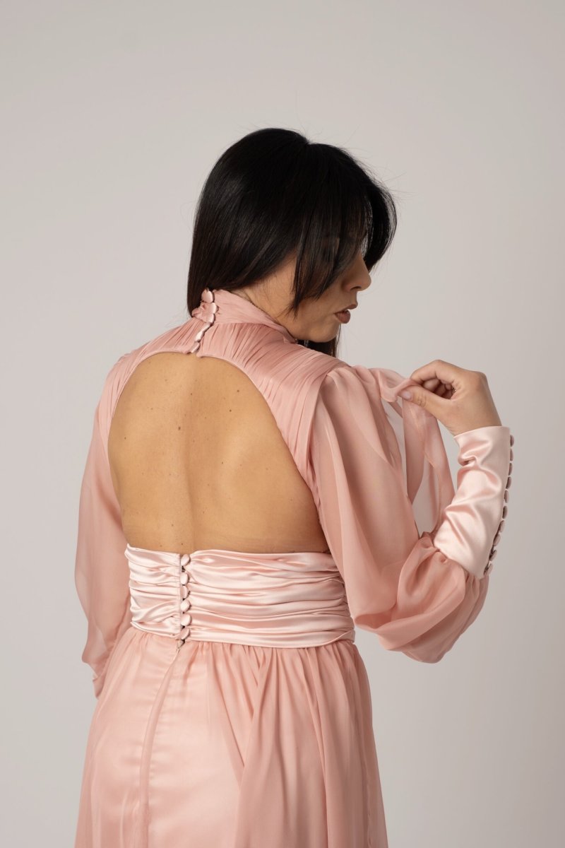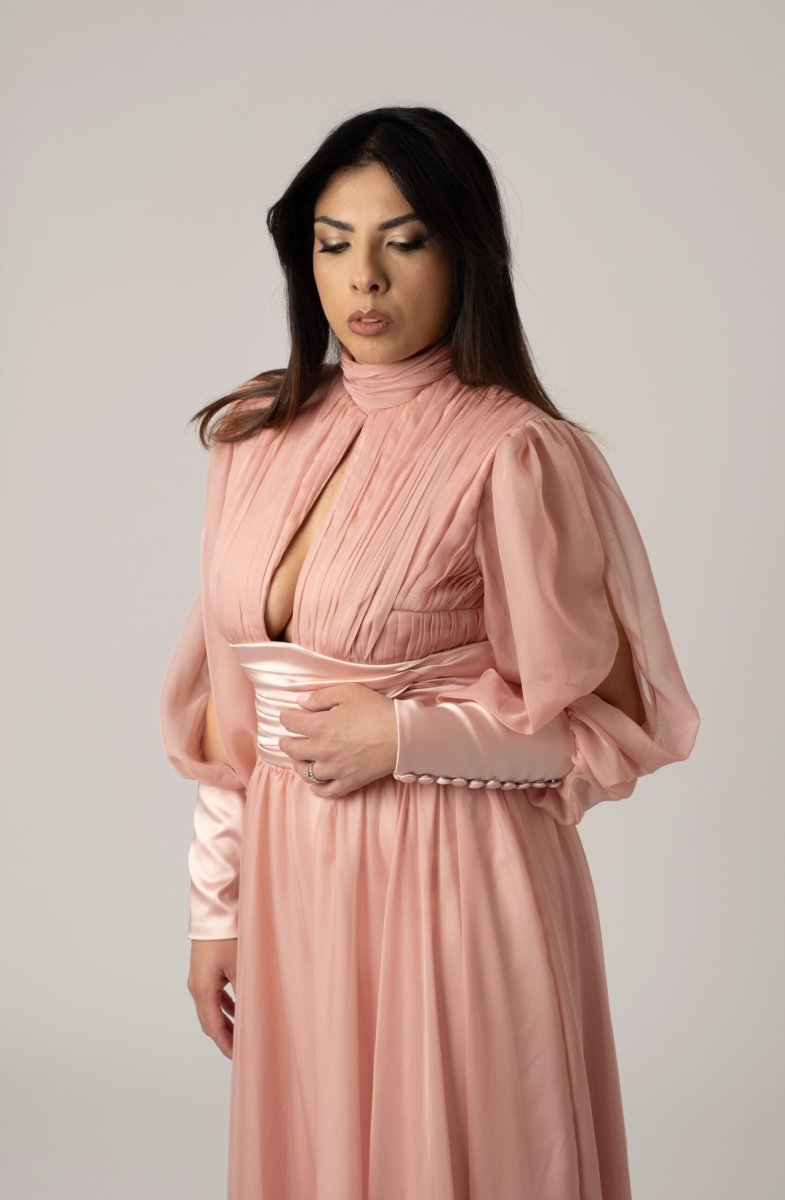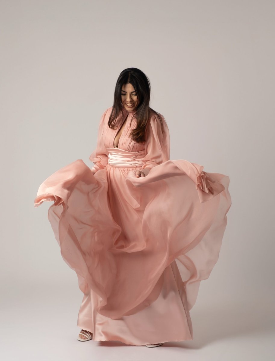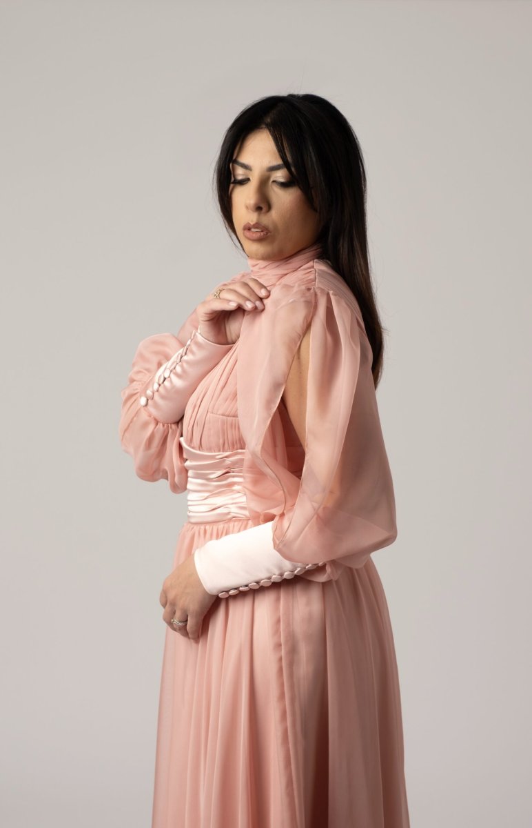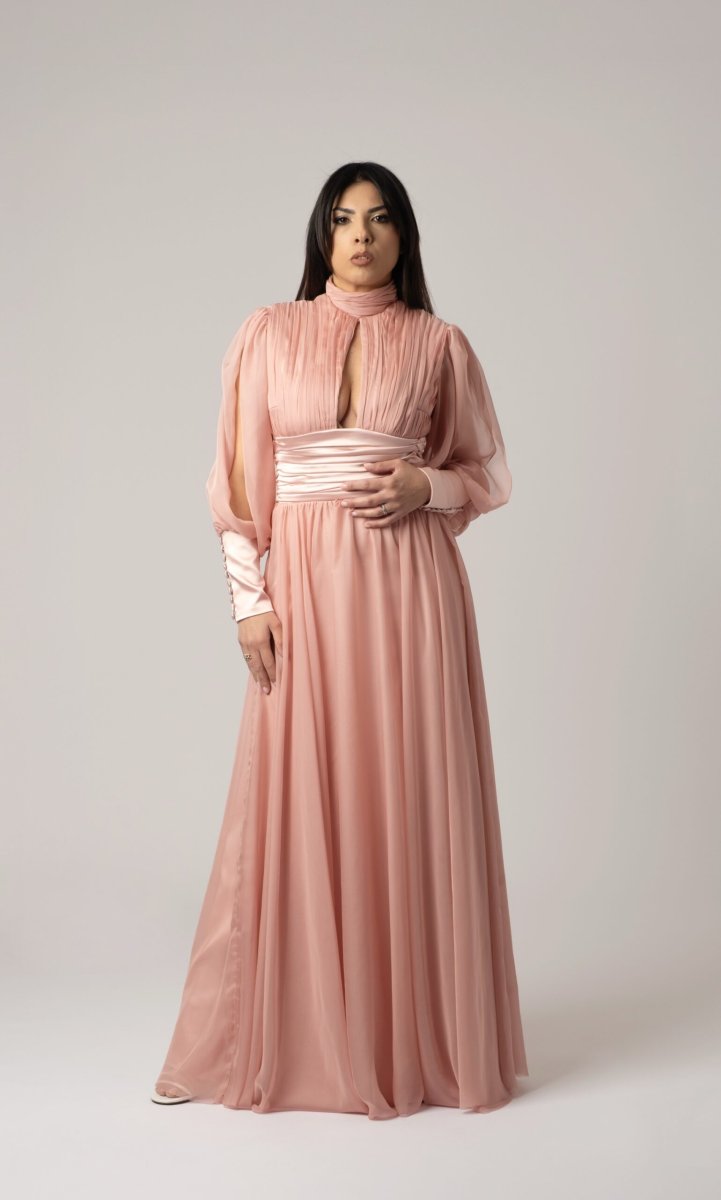 Un’eleganza senza tempo prende forma in questo abito sartoriale, realizzato con cura artigianale in chiffon plissettato e seta pregiata. La leggerezza dei tessuti si unisce a un design raffinato che accarezza la silhouette con grazia, offrendo movimento e raffinatezza a ogni passo. Perfetto per cerimonie, serate di gala o momenti speciali, questo abito incarna l’essenza della femminilità contemporanea con dettagli ricercati e una vestibilità impeccabile.