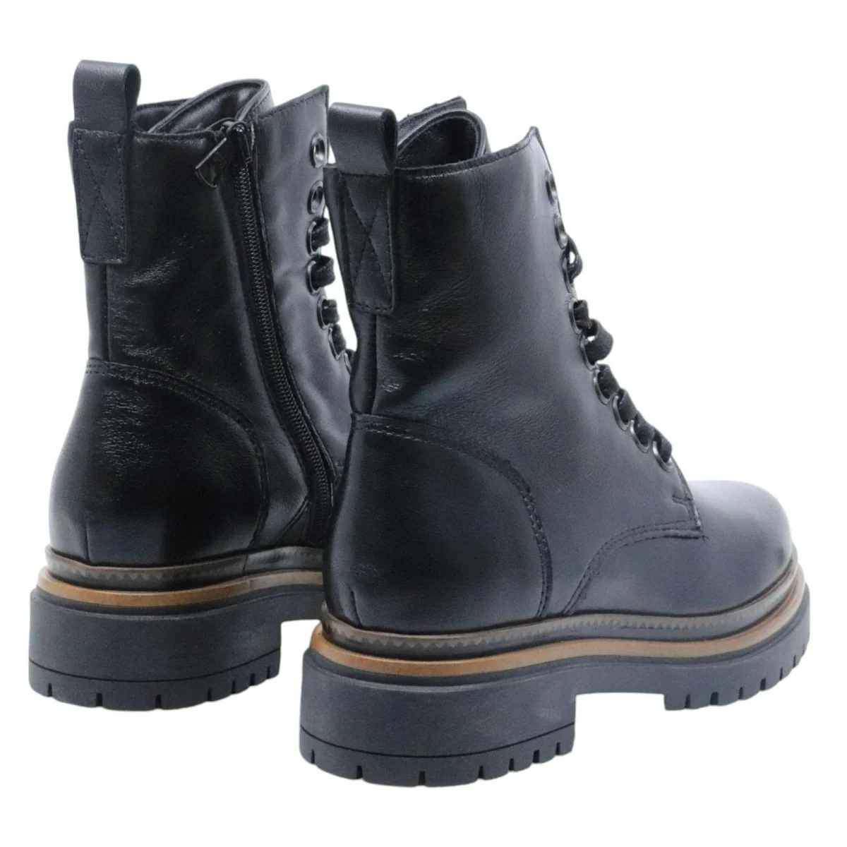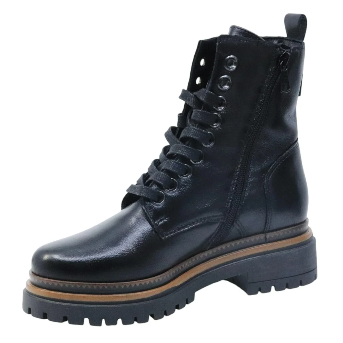 Anfibio Mjus T60209 da donna in pelle nera con suola in gomma carro armato. Questo anfibio ha una allacciatura regolabile e una chiusura a zip laterale. Il pellame è motlo morbido e confortevole. L’interno è in tessuto caldo. Modello T60209 Nero