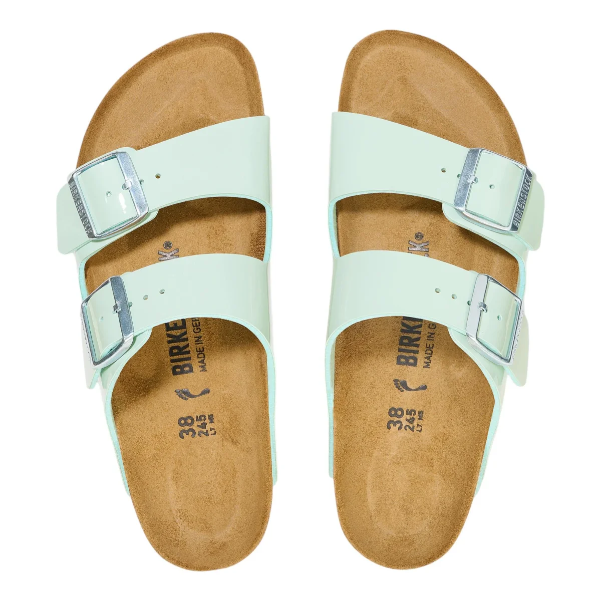 Birkenstock Arizona Patent sandalo doppia fibbia verde acqua lucido. Il modello ha due cinturini regolabili e plantare in sughero con forma anatomica del piede. La pelle viene lavorata senza cuciture per uno stile naturale e artigianale. Modello Arizona Birko Flor Patent Surf Green 1026963 – Calzata Narrow Fit