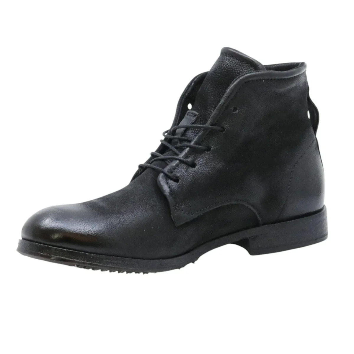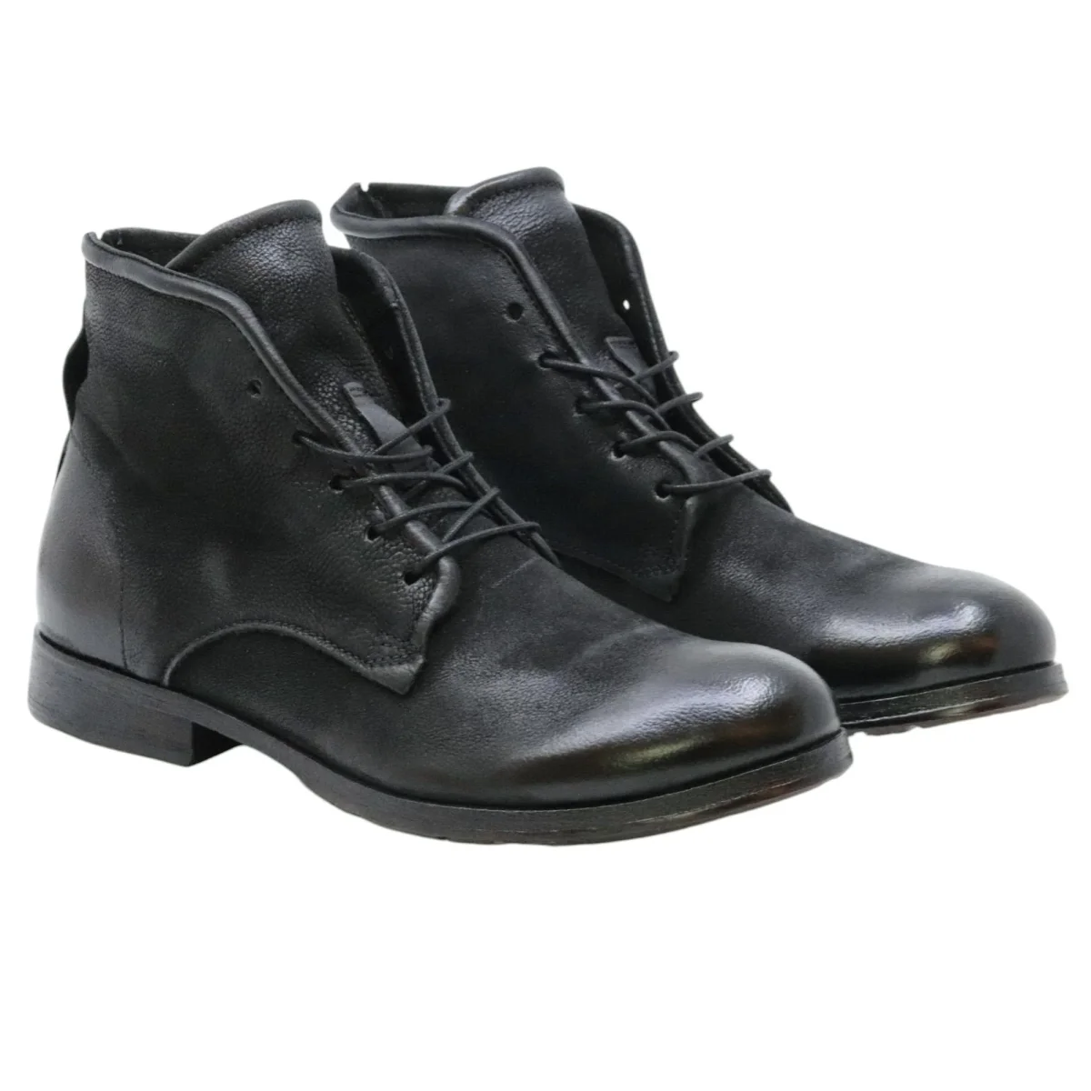 AS98 401201 Chad stivaletto uomo in pelle nera. Stivaletto da uomo A.S.98 dal carattere deciso, realizzato in pelle nera con effetto used che valorizza le sfumature naturali del materiale. Il design è essenziale ma grintoso, con allacciatura frontale e zip interna per una calzata pratica. La suola in gomma robusta assicura stabilità e comfort anche durante l’uso quotidiano. Un modello perfetto per look urban o casual con un tocco artigianale inconfondibile. Modello 401201 Chad Nero