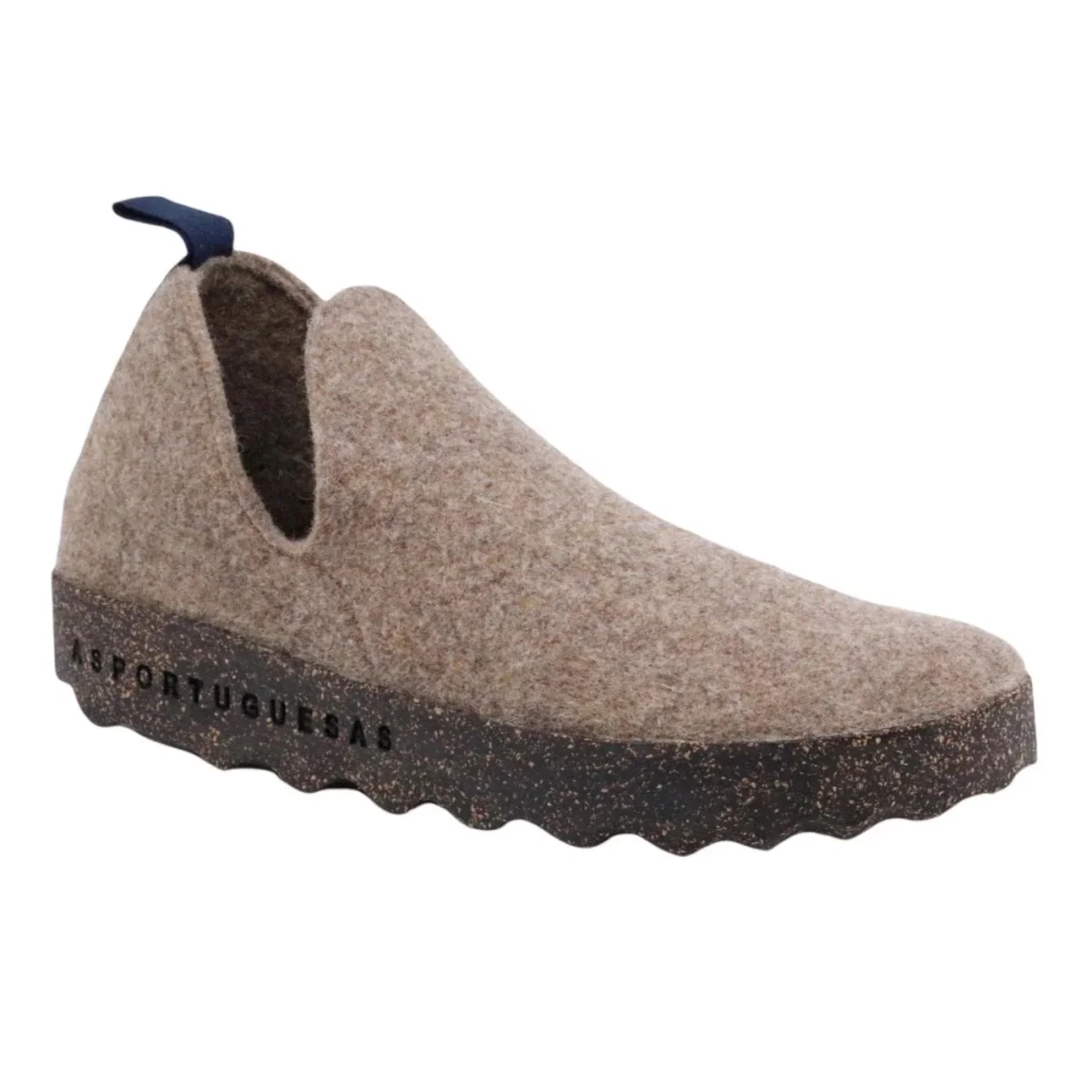 Asportuguesas City scarpa in lana naturale taupe, fodera in tessuto e suola in sughero misto a gomma. Pratica calzata senza lacci. La scarpa presenta un comodo plantare ergonomico e mantiene il piede in temperatura grazie alla fibra in lana. La calzatura è interamente ecosostenibile e il processo realizzativo produce emissioni dal basso impatto ambientale. Modello Asportuguesas City taupe tweed
