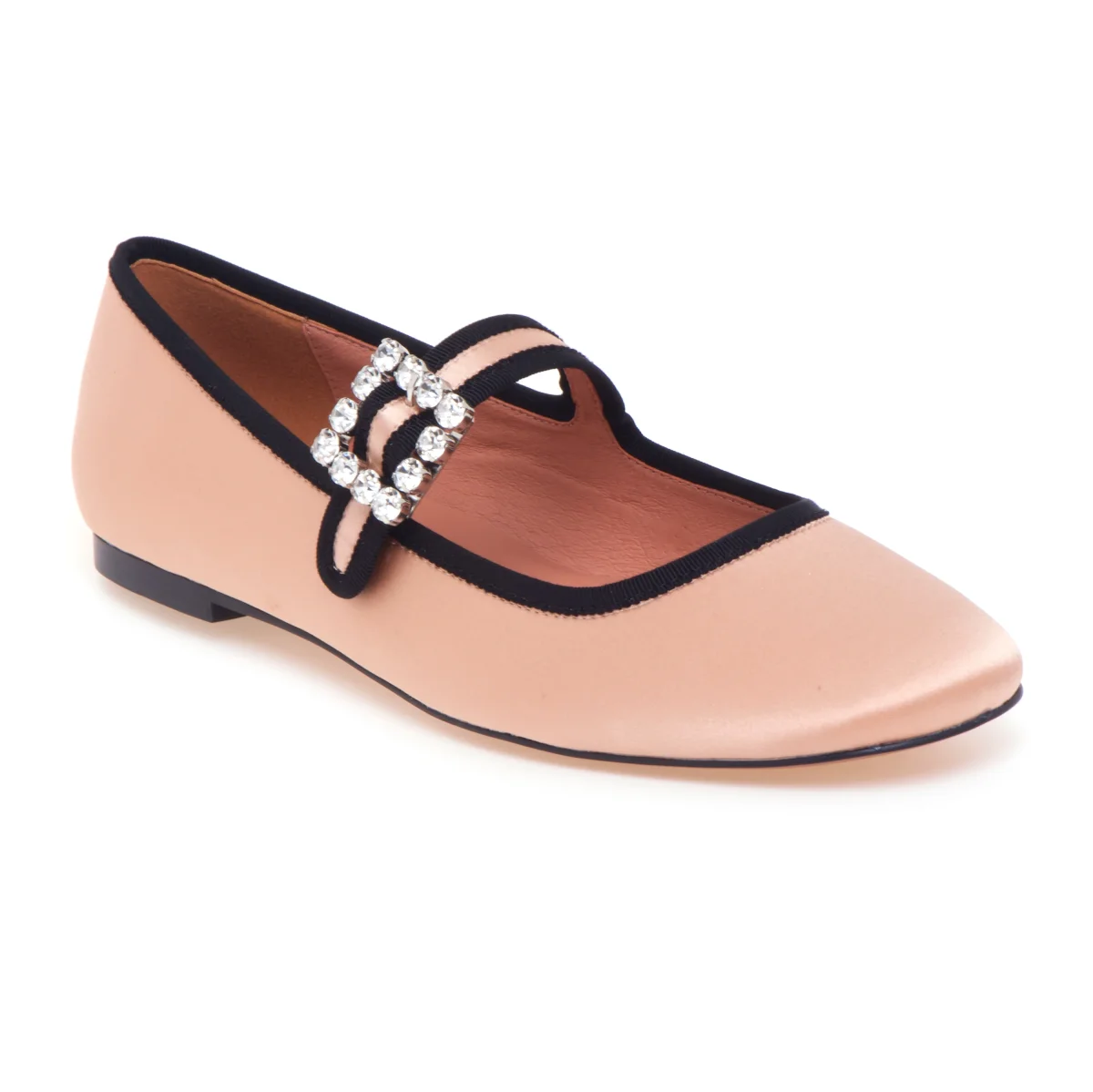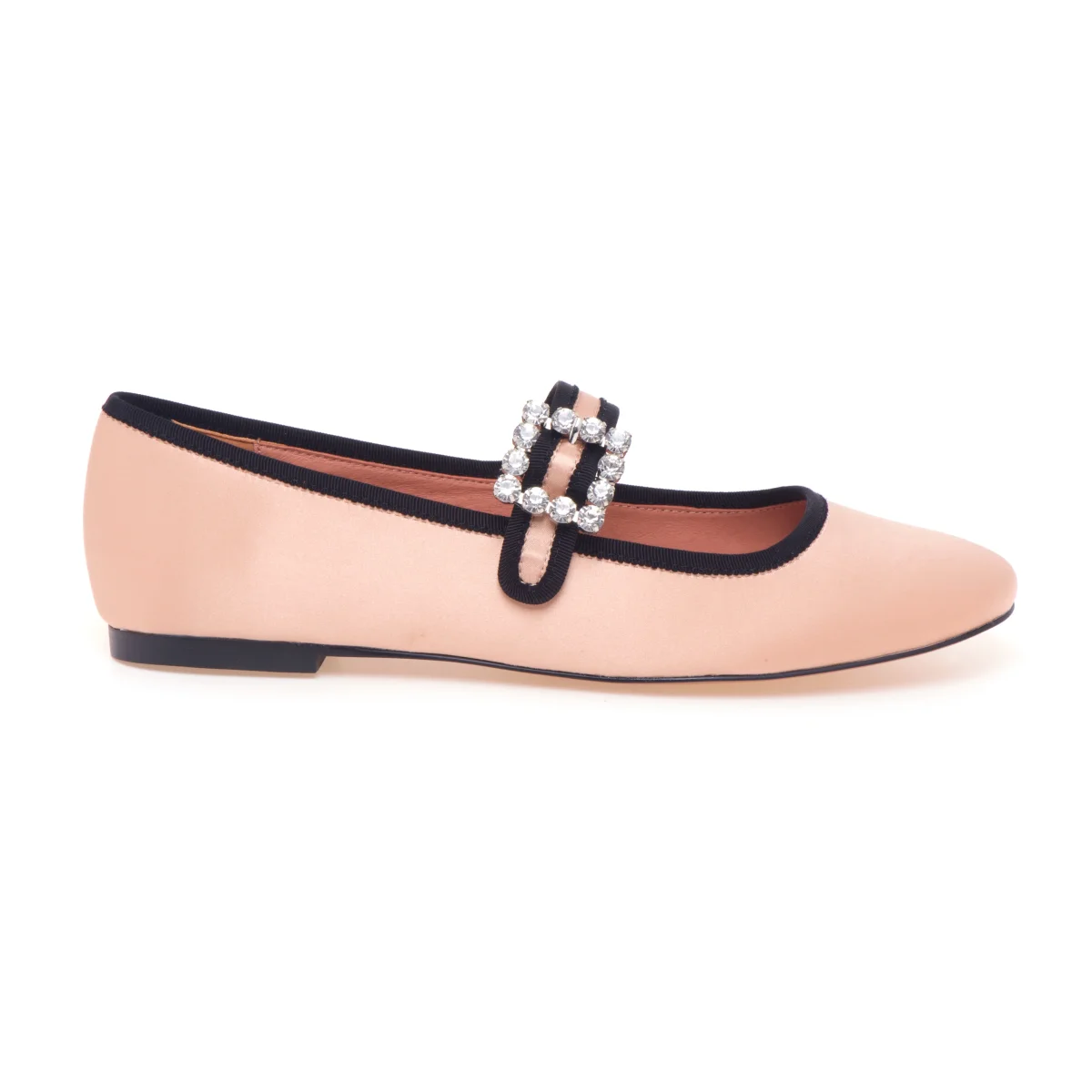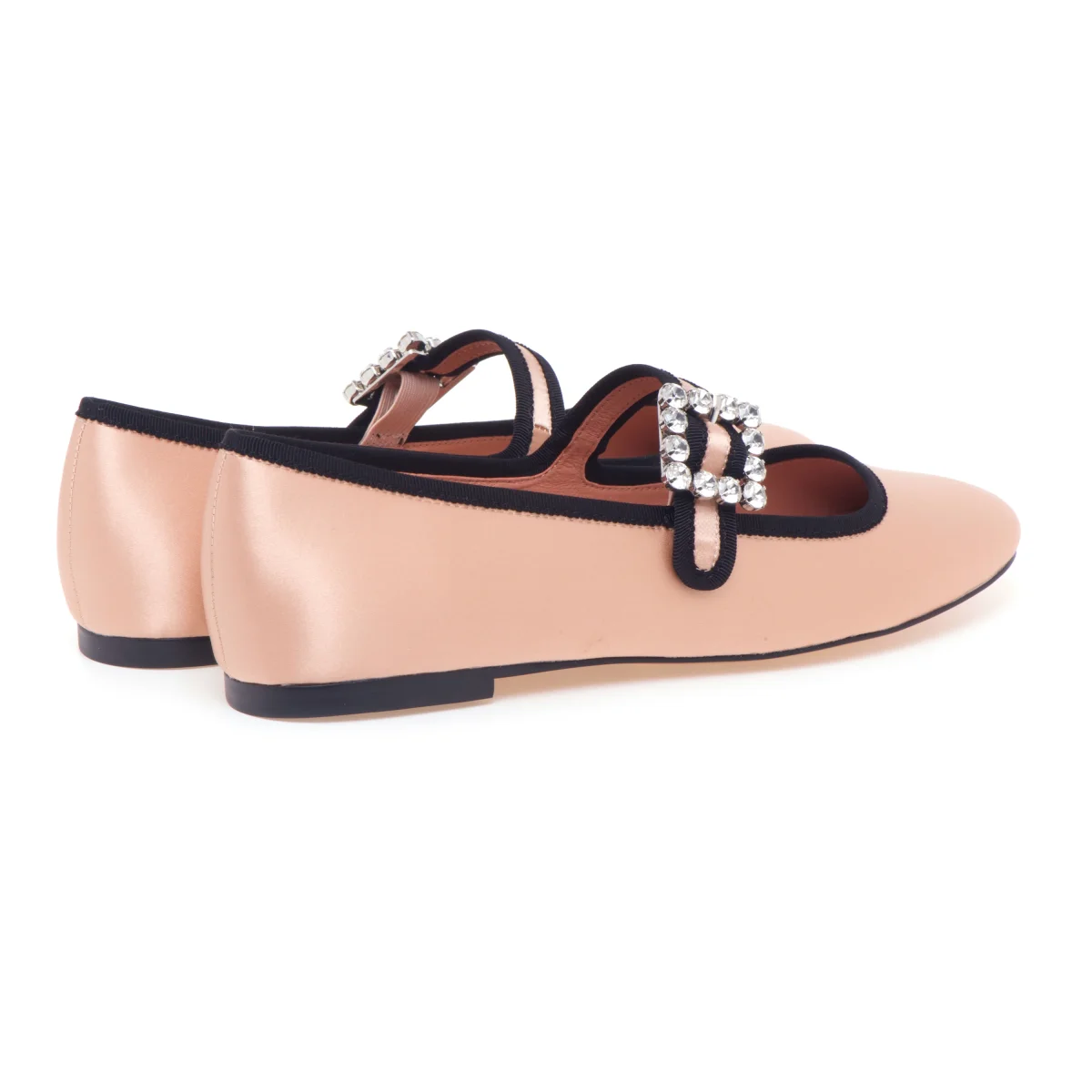 Ballerina Bibi Lou in raso con profili in tessuto nero a contrasto e cinturino sul collo del piede impreziosito dalla fibbia con strass.