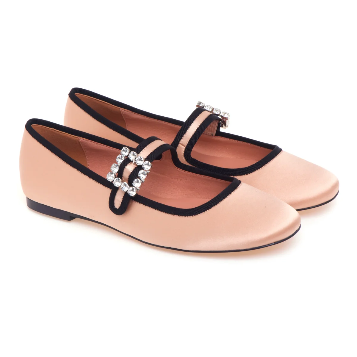 Ballerina Bibi Lou in raso con profili in tessuto nero a contrasto e cinturino sul collo del piede impreziosito dalla fibbia con strass. # Fodera in pelle. # Sottopiede in pelle. # Suola in gomma.