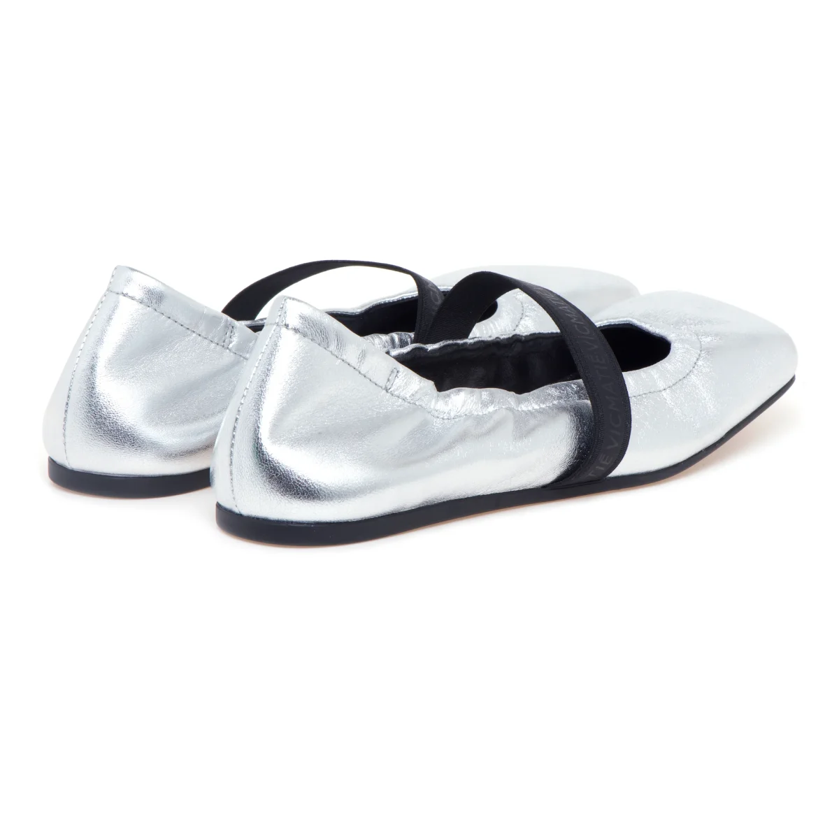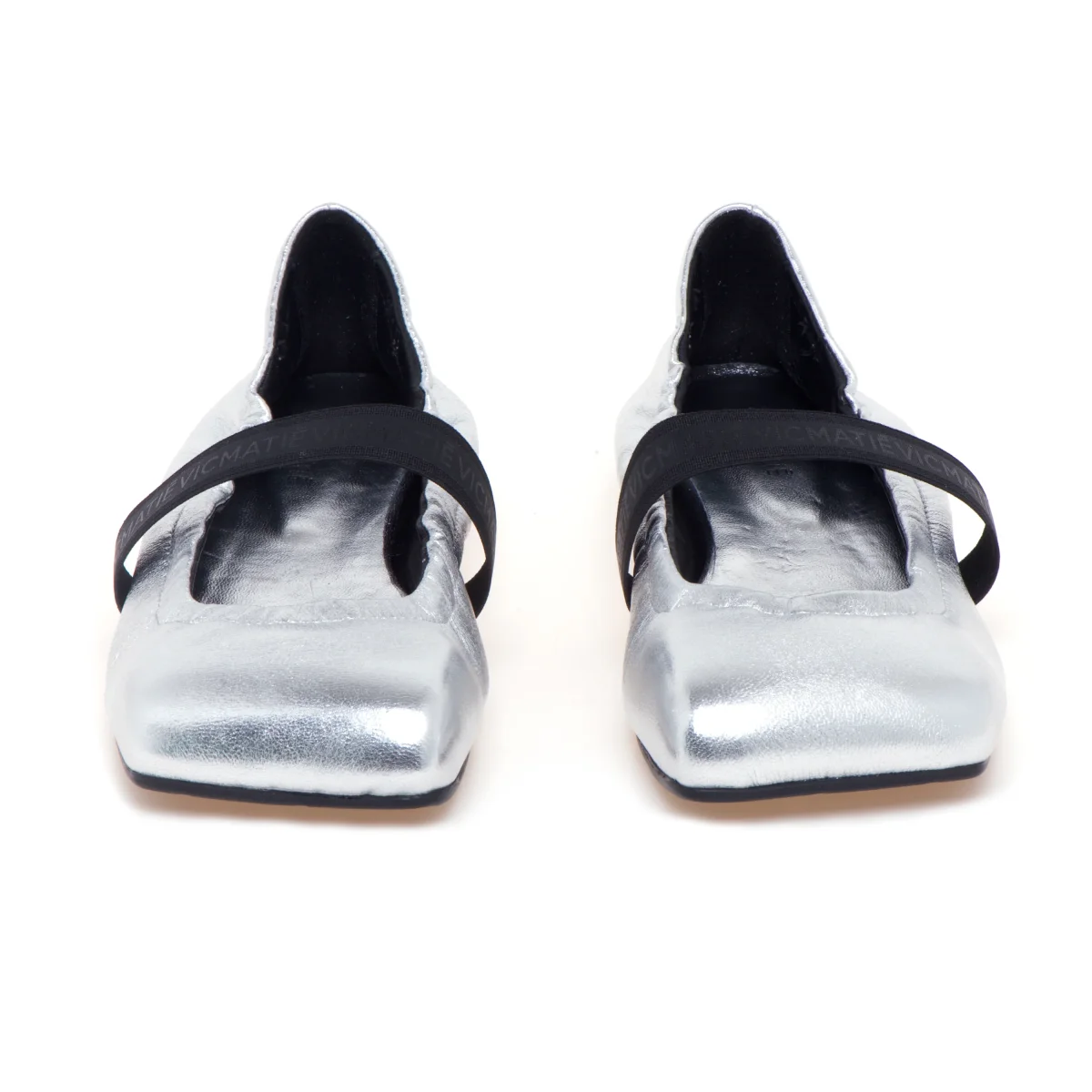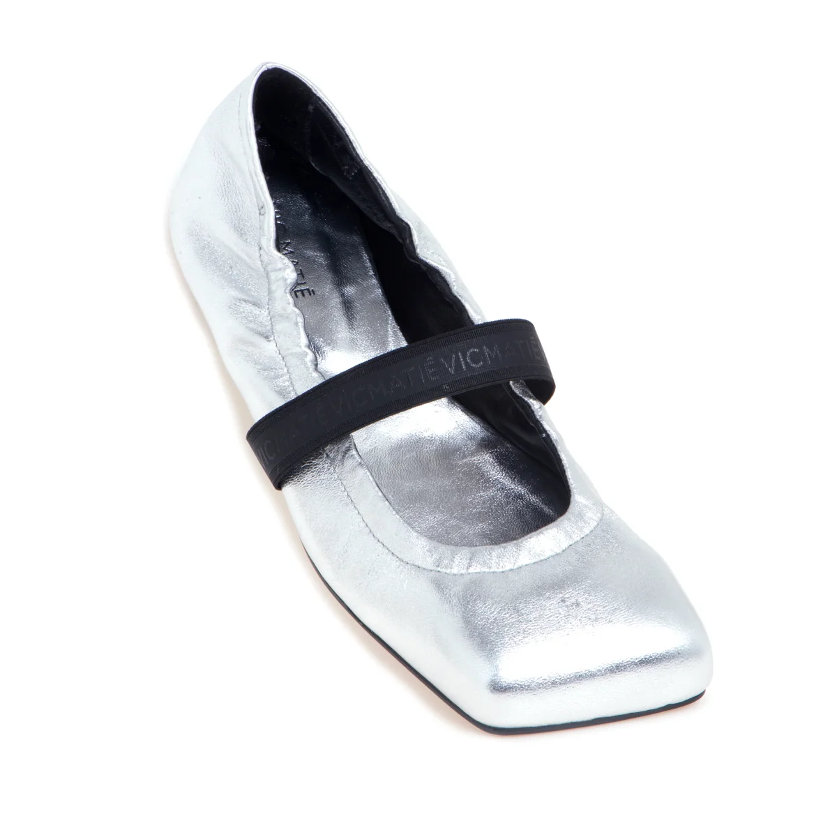 lo stile unico di Vic Matiè trova la sua miglior espressione in questa nuova ballerina dallo stile ricercato realizzata in morbida nappa color argento e caratterizzata dalla punta squadrata.