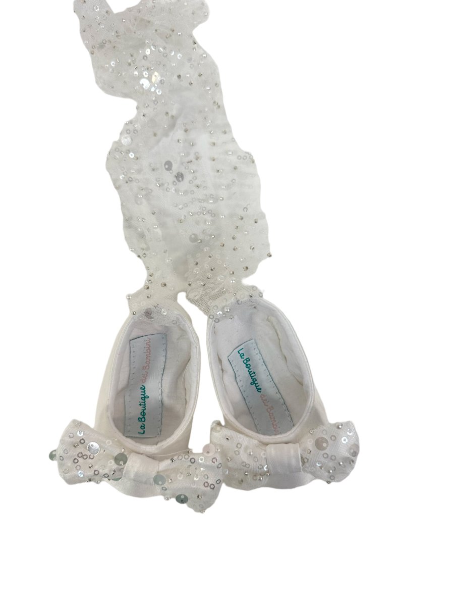 Ballerine culla in seta con fiocco e lacci con perline e paiette
