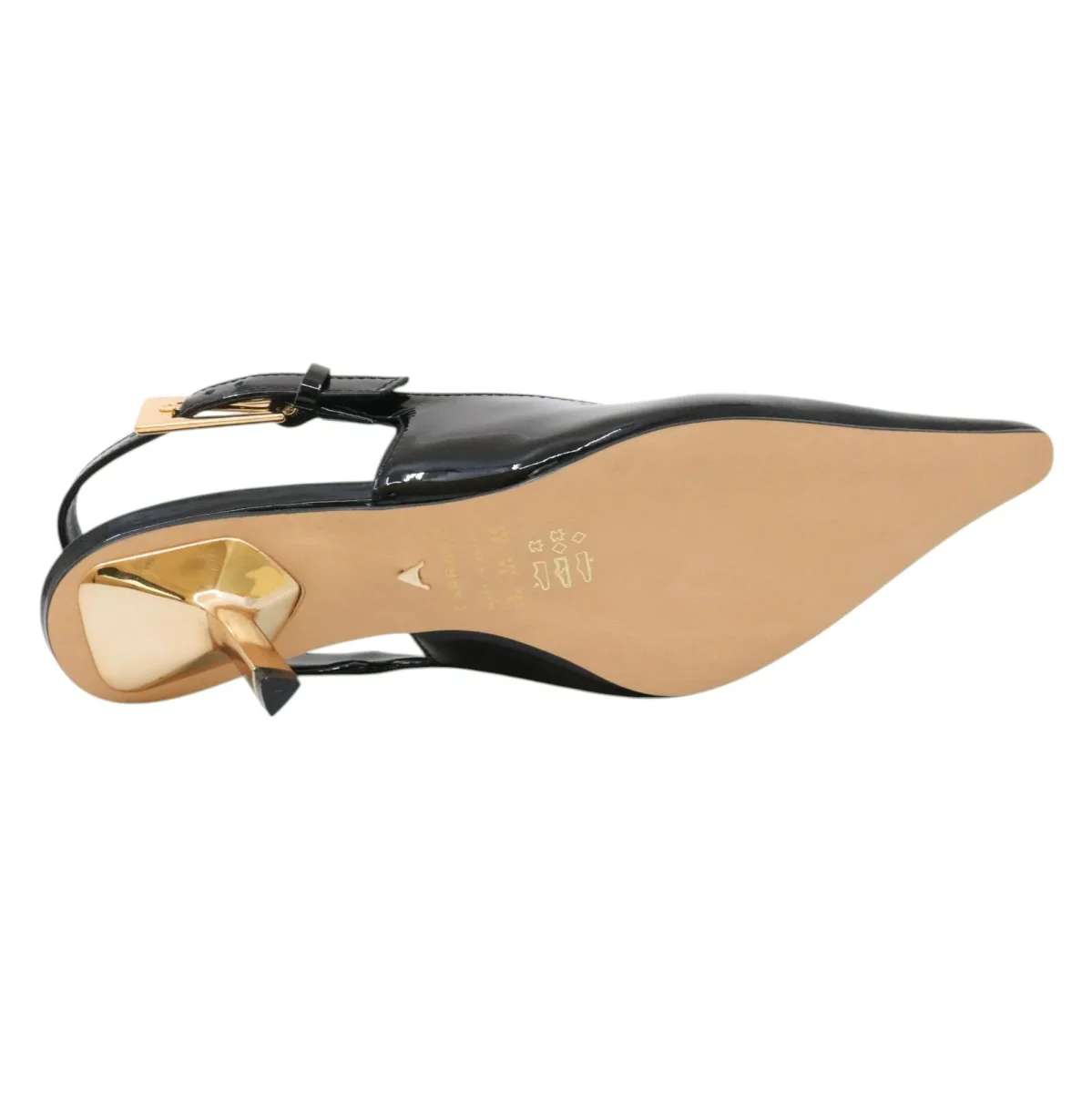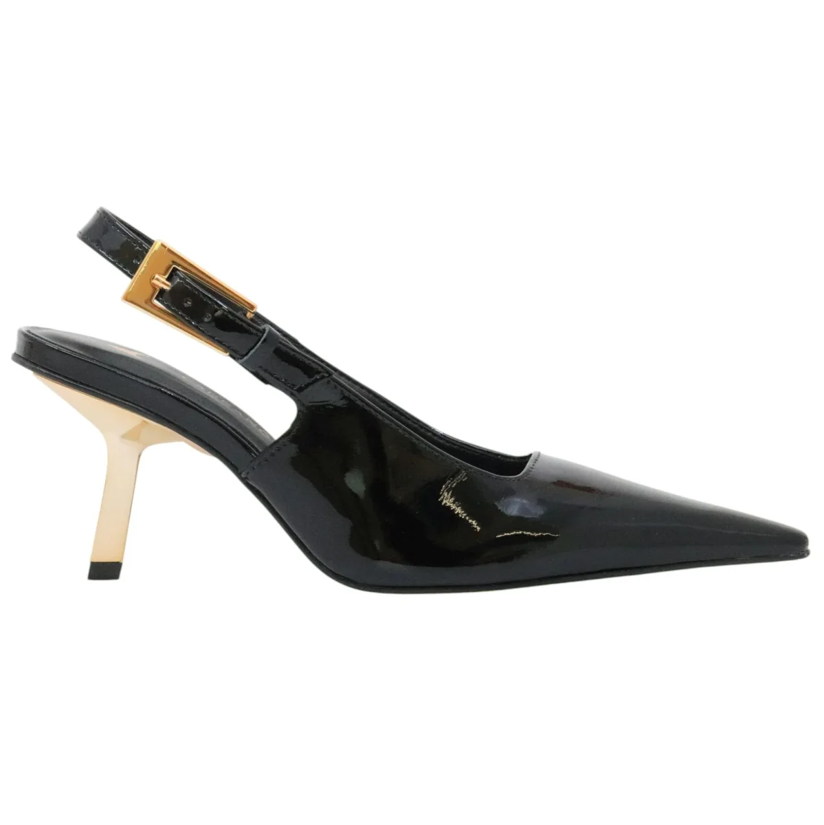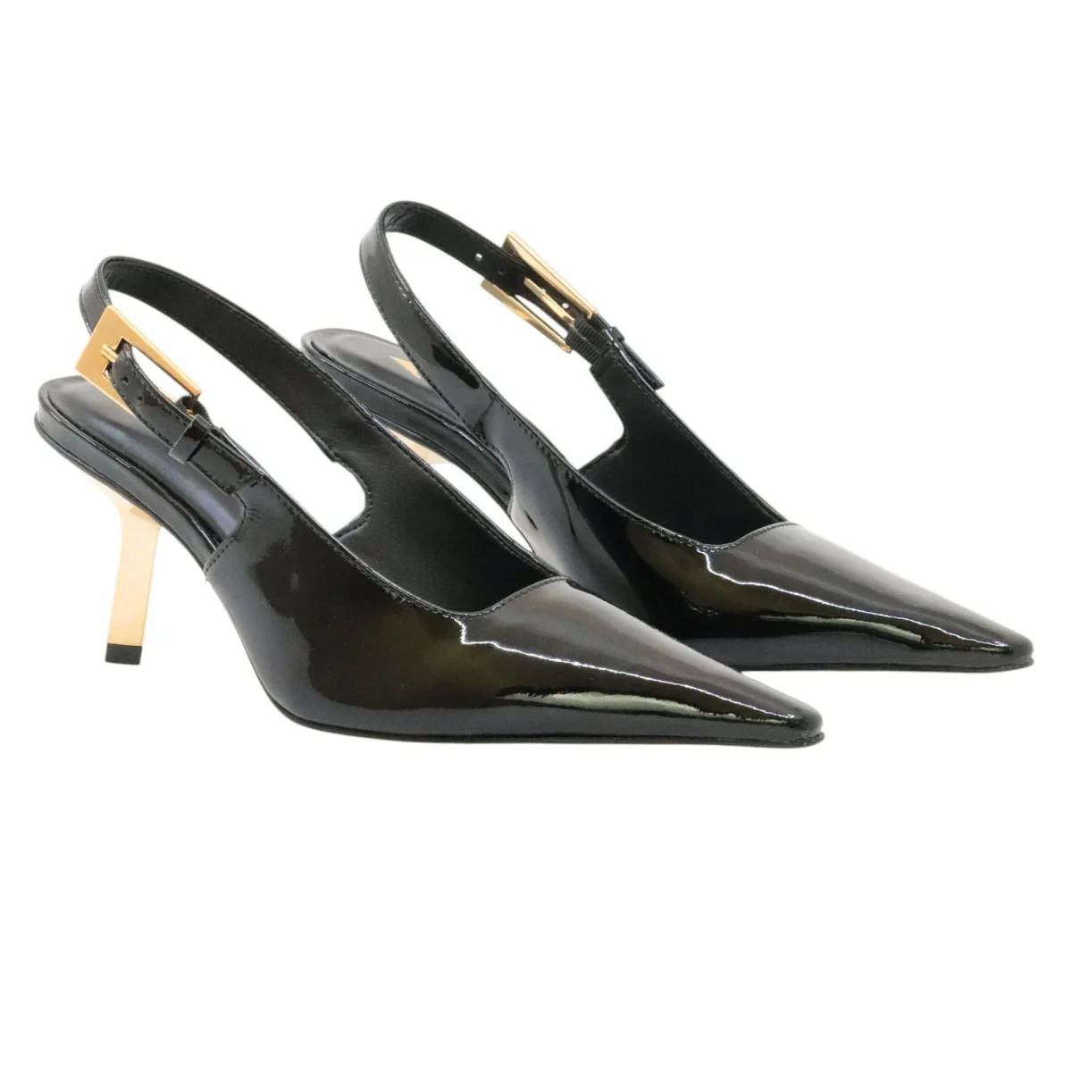 Carrano 877001 slingback donna pelle vernice nera tacco 8,5 cm. Una slingback elegante e slanciata, perfetta per occasioni in cui vuoi brillare con stile. Carrano interpreta la femminilità con linee affusolate, materiali pregiati e dettagli dorati che valorizzano ogni passo. Realizzata in pelle verniciata nera lucida, questa slingback è impreziosita da una fibbia dorata sul cinturino e da un tacco scultura in tinta oro da 8,5 cm. La silhouette a punta dona un’allure sofisticata, mentre la suola in gomma assicura comfort e aderenza. Un modello che unisce design glamour e praticità, ideale per cerimonie, eventi o per dare un tocco chic a un look serale. Modello 877001 Verniz Black