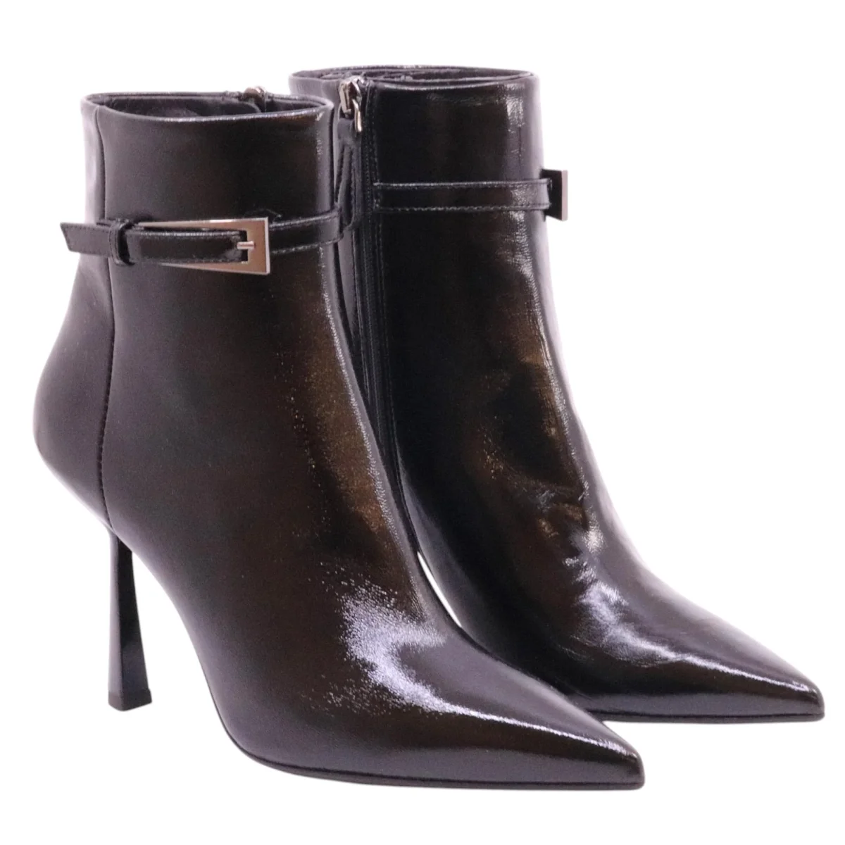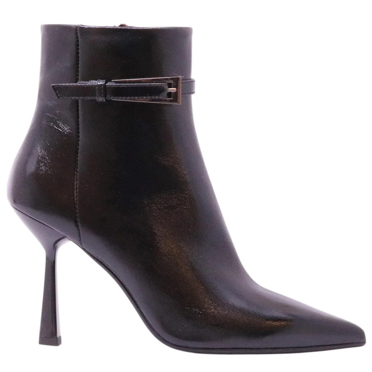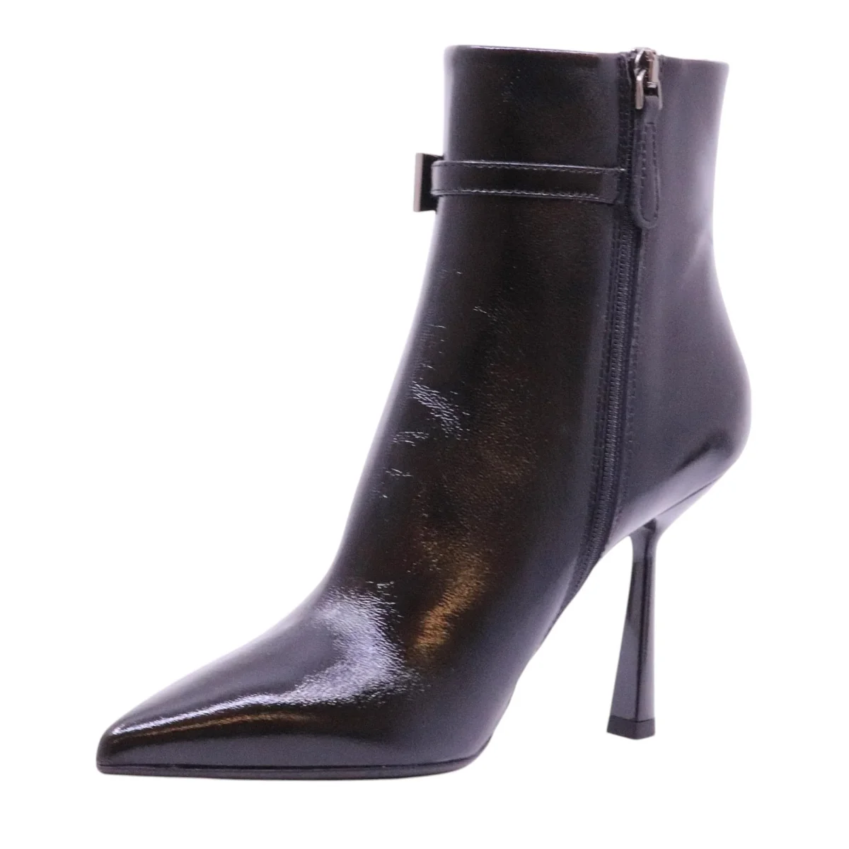 Chantal 2732 tronchetto donna pelle verlux nera tacco alto 10 cm. Eleganza e carattere si incontrano in questo tronchetto nero firmato Chantal. La finitura verlux dona alla pelle un effetto lucido e sofisticato, perfetto per completare outfit serali o look cittadini dal gusto deciso. La silhouette affusolata con punta sfilata e cinturino laterale decorativo valorizza la caviglia, mentre il tacco alto da 10 cm, slanciato ma stabile, regala una camminata sicura. La zip interna consente una calzata facile e veloce, mentre la suola in cuoio con mezzapianta in gomma garantisce aderenza e durata. Un modello che unisce femminilità, design e qualità artigianale Made in Italy. Modello 2732 Verlux Nero