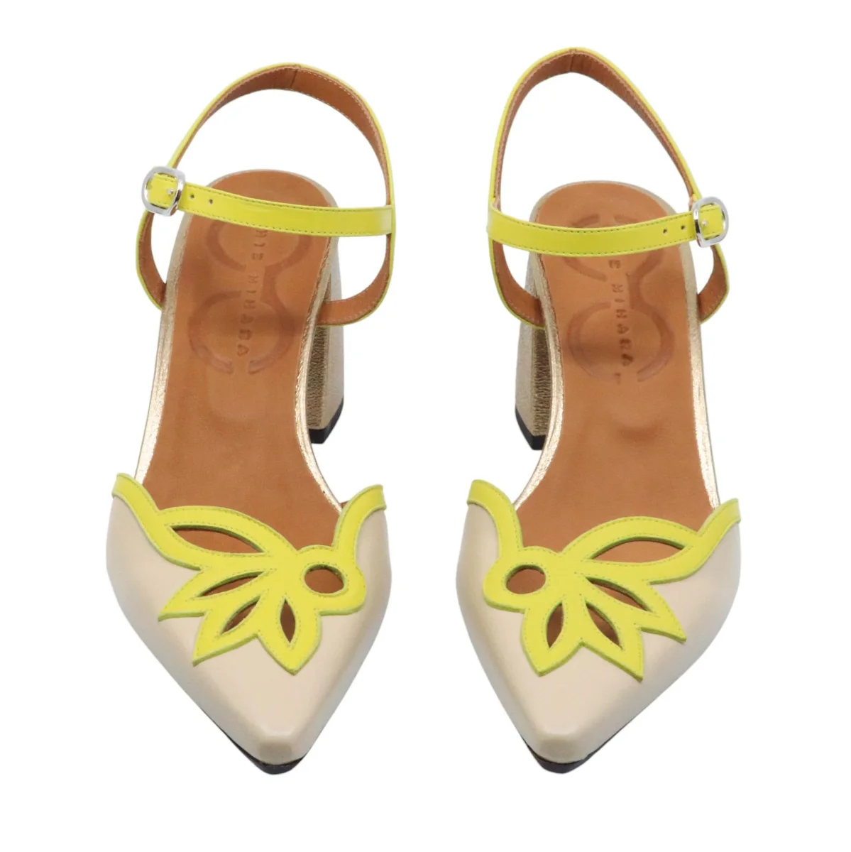 Chie Mihara Abina slingback donna in pelle crema in punta e pelle gialla. Pratico cintino regolabile alla caviglia. Il tacco in pelle con effetto crack platino è alto 8 cm. La suola è in cuoio con mezza piantina in gomma. Prodotto made in Spain. Modello Abaina Linda Cream Linda Sun