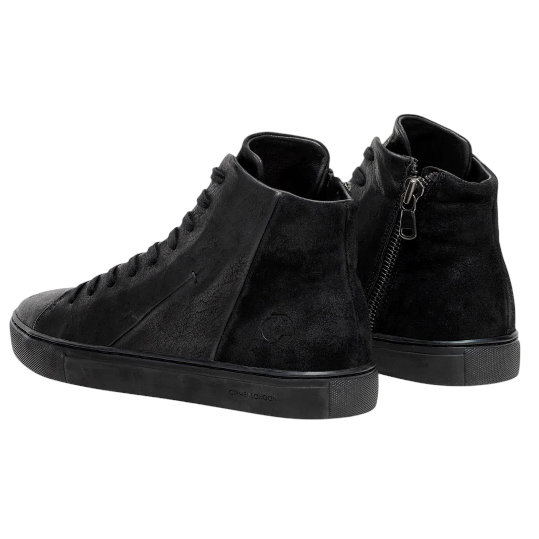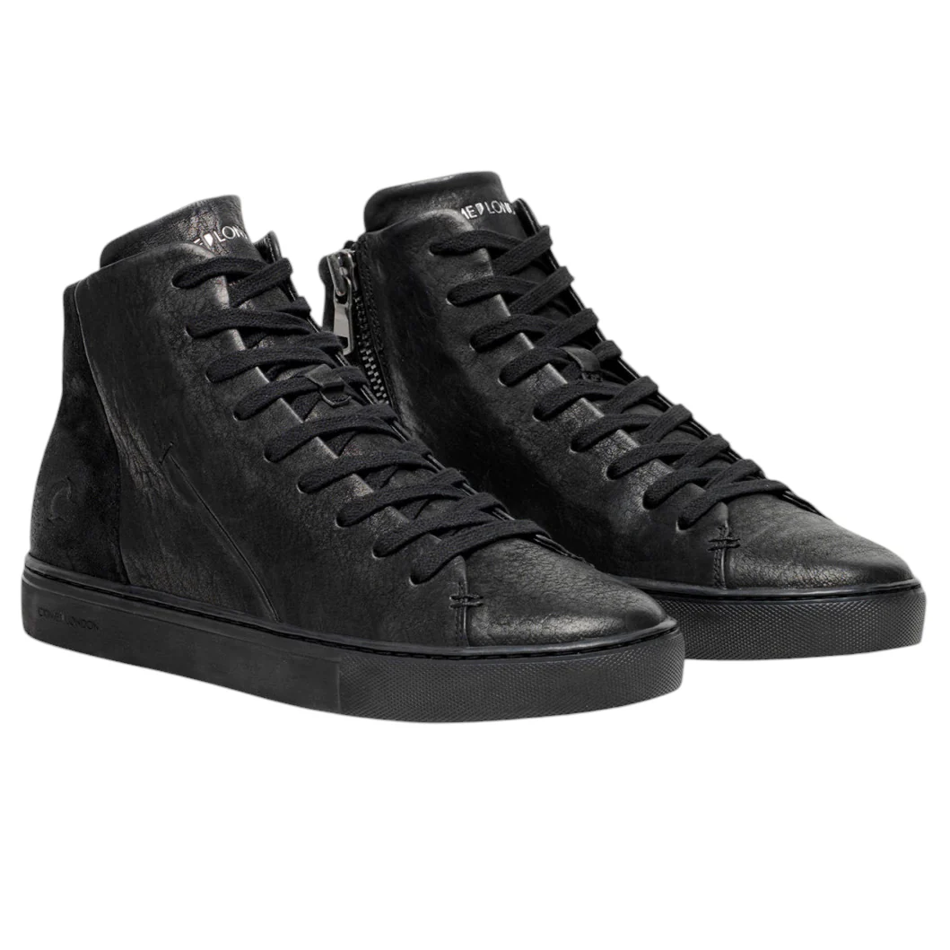Crime London 11670 High Top Essential sneaker uomo in pelle nera con linguetta in pelle nera effetto invecchiato. Pratica chiusura con zip laterale. Il plantare interno estraibile è rialzato nella parte del tallone e questo permette una comoda camminata. La suola è in gomma. Modello 11670 High Top Essential