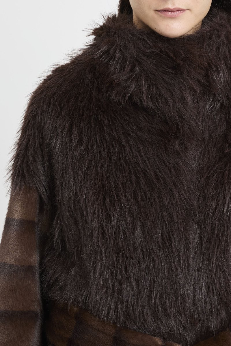 Ecopelliccia Bully corta dal look contemporaneo e avvolgente: la superficie gioca su due lunghezze di pelo, più lungo sul davanti fino al collo alto per un effetto morbido e scenografico, più corto su maniche, fianchi e retro per mantenere la linea ordinata.