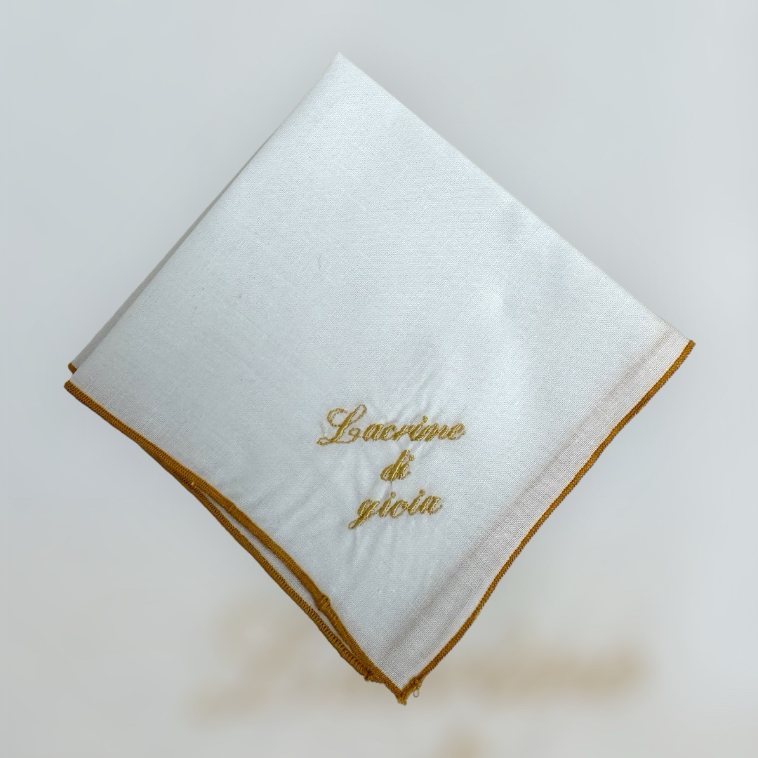 Fazzoletto in cotone con bordino a contrasto e frase incisa , ideale da regalare agli invitati al matrimonio dimensione 20×20