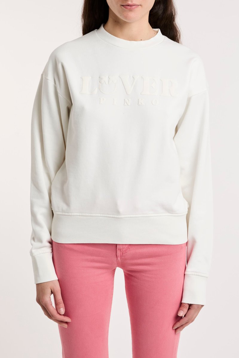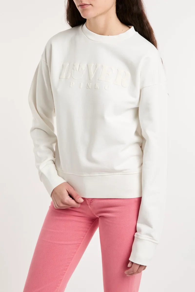 Felpa da donna in cotone 100%, dal design minimal e contemporaneo. Il capo è arricchito dal logo “Lover Pinko” stampato con un esclusivo effetto gommato, che aggiunge un tocco distintivo alla texture morbida del tessuto. La vestibilità comoda e il taglio essenziale rendono questa felpa un’alleata perfetta per i look quotidiani, da abbinare a jeans e sneakers per un outfit casual e disinvolto, oppure a pantaloni più strutturati per un contrasto di stile interessante.