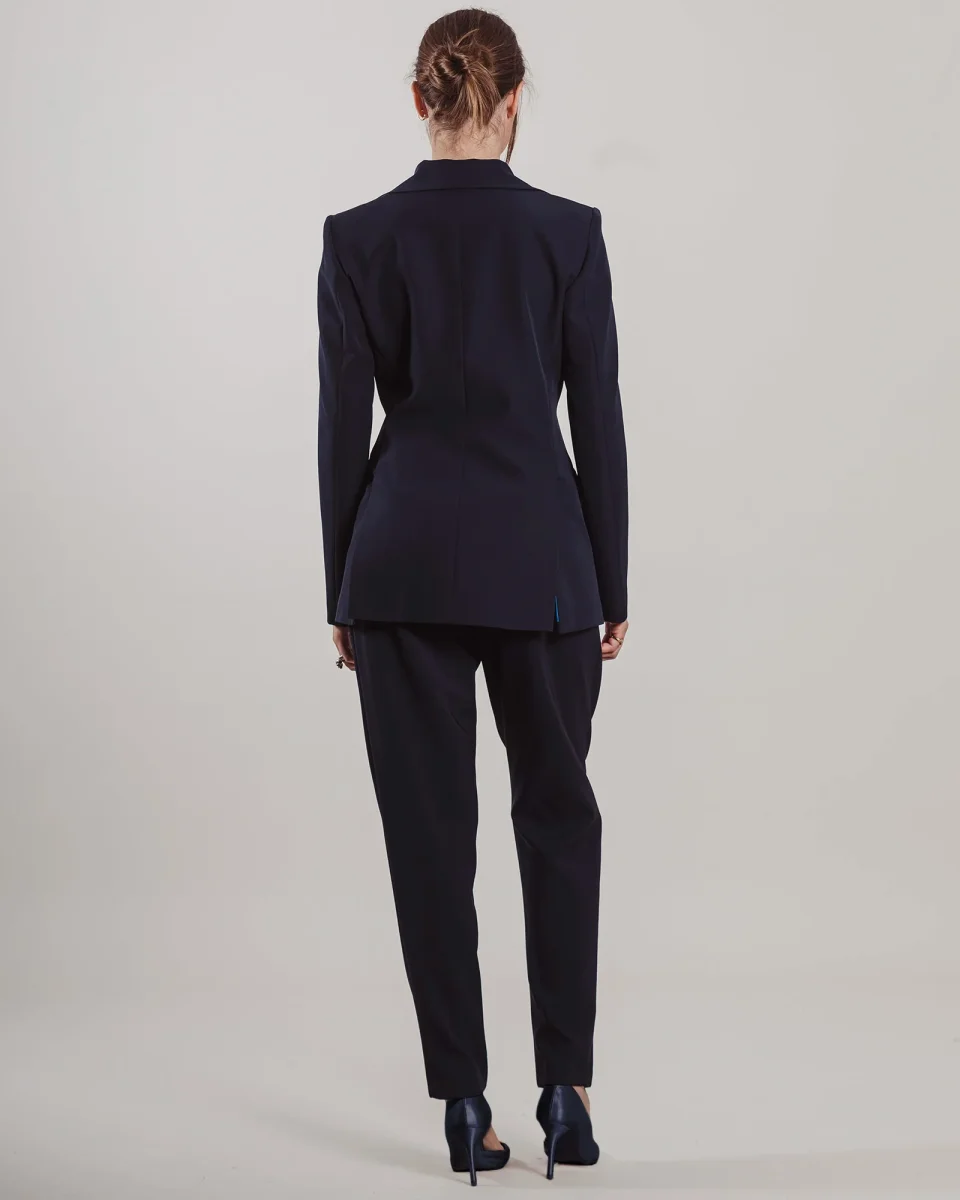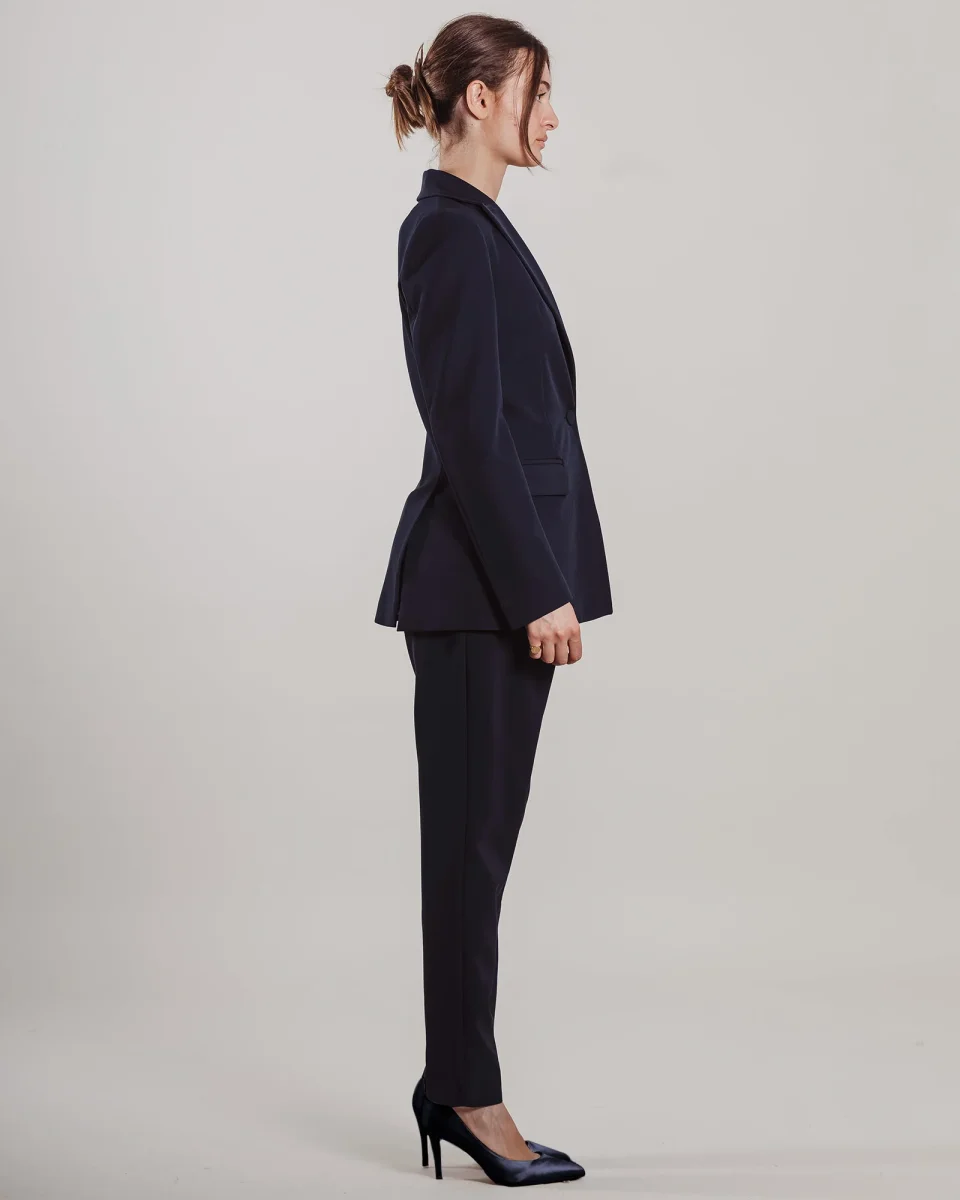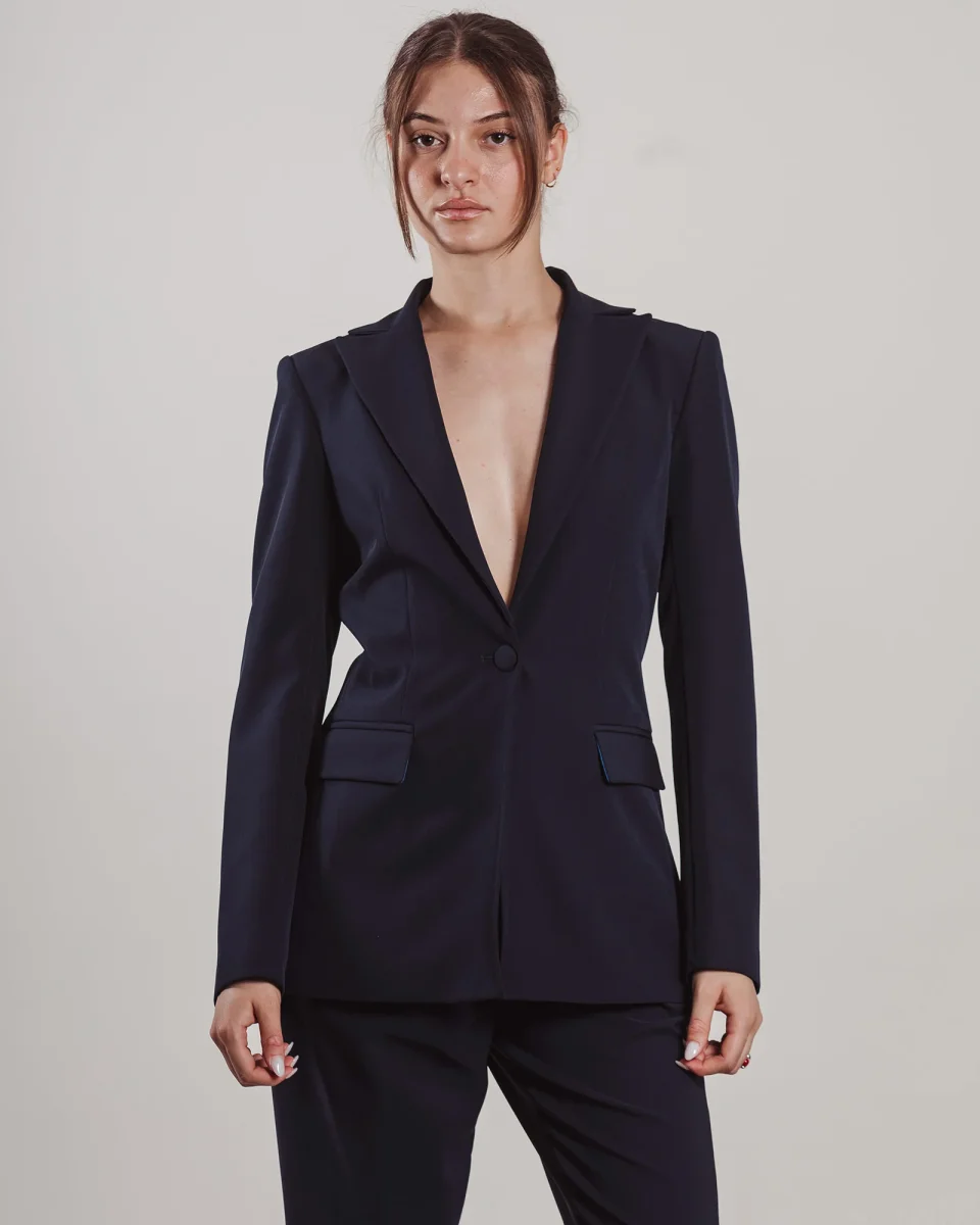 Giacca un petto moro Tasche con pattine Un bottone ricoperto tono su tono Due spacchi laterali dietro Foderata internamente Composizione: 90%Poliestere 10%Elastane La giacca è abbinabile al pantalone PA015U 89 BLU La modella è alta 1.70 indossa TG 40