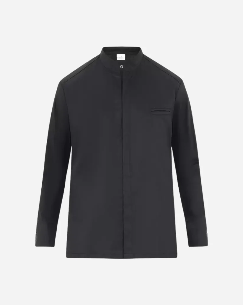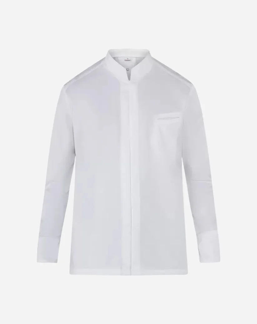 La giacca Ascanio è una nuova proposta della collezione Giblor’s “Elegance” di alta gamma. È realizzata in Tencel™ elasticizzato bianco brillante di nuova generazione, di alta qualità e dalle alte performance. Ha un’armatura gabardina poco visibile per via dell’elastan ed è resistente alle alte temperature. La giacca Ascanio ha il collo coreano a squadra, un’abbottonatura centrale con piega baciata con cinque automatici nascosti, un taschino con doppio filetto lato cuore e il portapenne logato con il ricamo G’; le maniche, con polsino a camicia, sono impreziosite da un bottone automatico gioiello di forma rettangolare nella galvanica nickel. Il taglio sfiancato e gli spacchi posteriori in stile classico facilitano il movimento, mentre l’asola sul retro del collo è pensata per inserire il laccio del grembiule. La giacca è proposta nelle eleganti varianti bianco e nero.