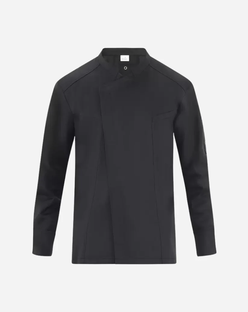 La giacca Edwin, con il suo stile eclettico, è realizzata in Tencel™ elasticizzato bianco brillante di nuova generazione, di alta qualità e dalle alte performance. Ha un’armatura gabardina poco visibile per via dell’elastan ed è resistente alle alte temperature. Dal gusto contemporaneo, la giacca Edwin presenta un collo frutto di un connubio stilistico fra coreano e francese. Ha un’abbottonatura nascosta doppio petto, con cinque automatici e presenta un motivo a taglio sagomato sulla parte anteriore e posteriore che assicura una vestibilità aderente. Presenta un taschino lato cuore mentre il portapenne è posizionato sulla manica ed è logato con il ricamo G’. Il fondo manica è caratterizzato da polsini stile camicia, chiusi con un bottone automatico nascosto. Nella parte posteriore del collo presenta un’asola che serve ad inserire e fissare il laccio del grembiule ed interamente ribattuta da un’impuntura a piedino che ne rimarca il taglio. La giacca è proposta nelle eleganti varianti bianco e nero.