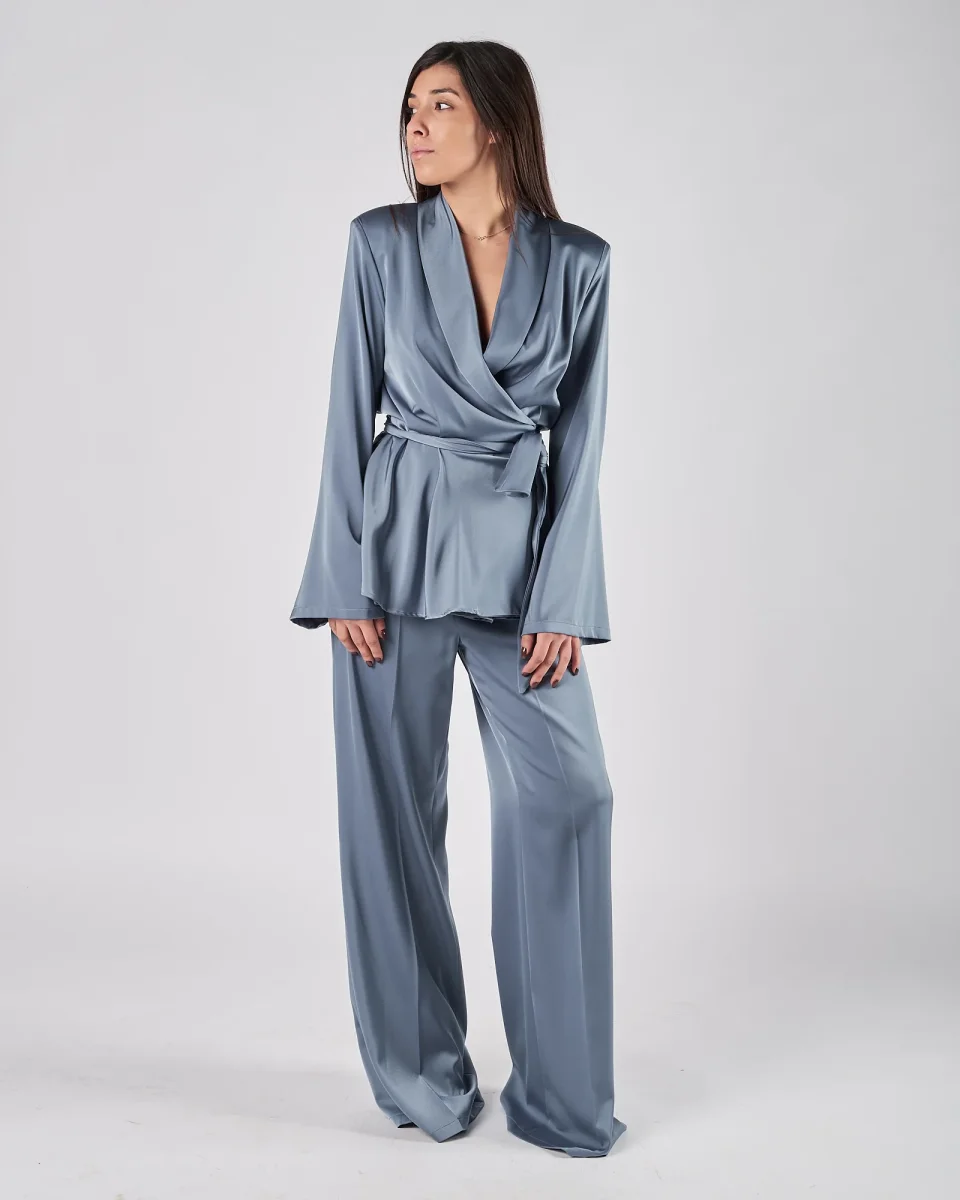 Giacca in satin colere denim Scollo a lancia Tessuto raso Cintura in vita regolabile Manica lunga Composizione: 65% PL, 30% VI, 5% SP