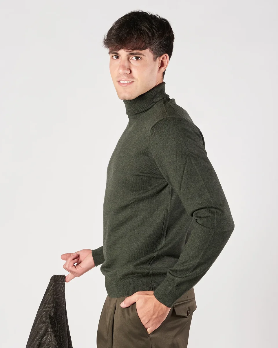 Maglia dolevita in lana verde Maniche lunghe Vestibilità regolare Composizopne: 100% LANA MERINOS EXTRA FINE Il modello è alto 1.80 indossa TG 50